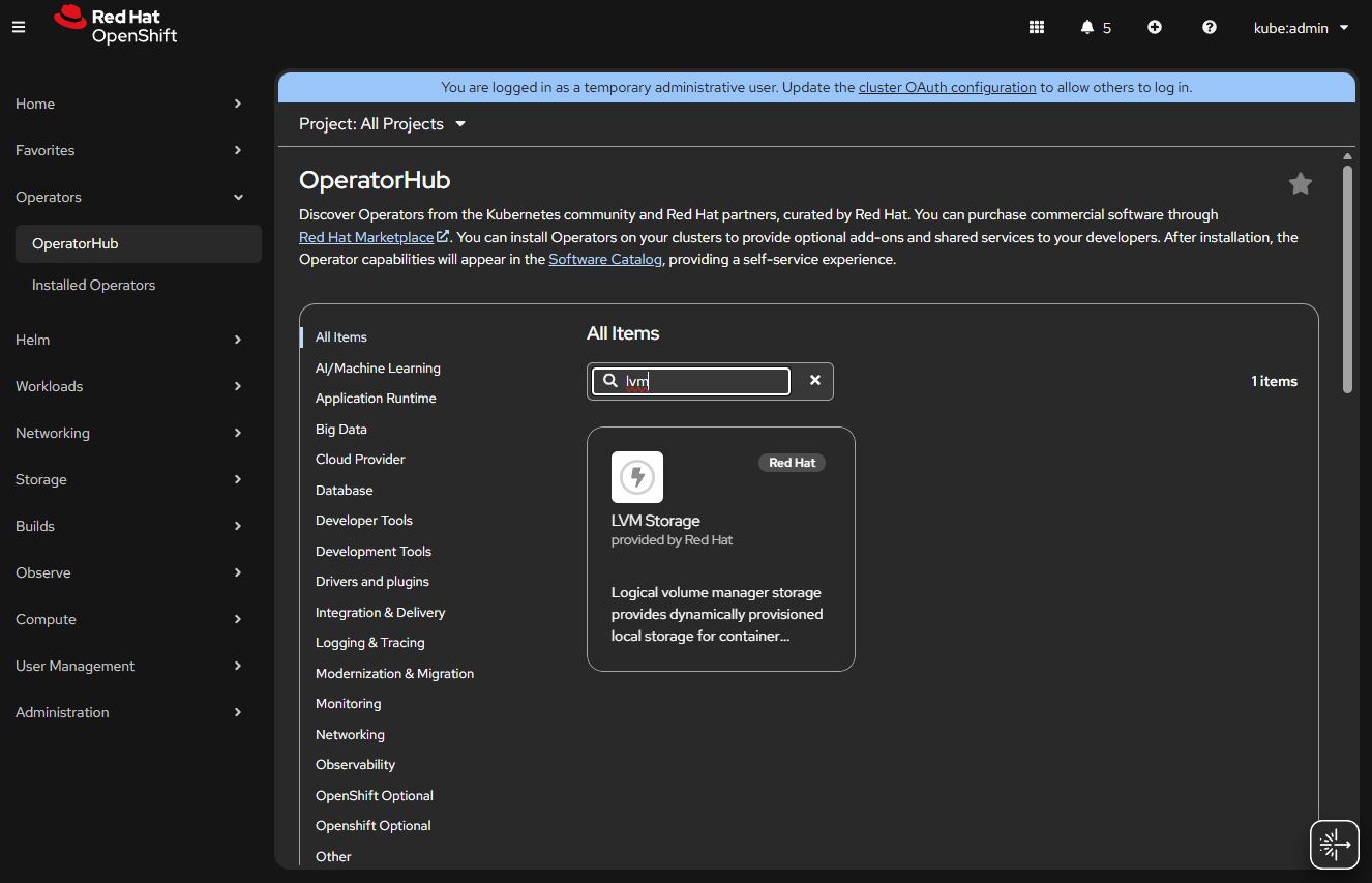 We now have our SNO node stood up, and we have our networking how we want it; it’s time to get storage configured to host VMs. OpenShift is Kubernetes with some opinions. Like picking a Linux distribution, there are many paths and OpenShift helps put you on one, making it easier to start with Kubernetes. OpenShift also comes with multiple Operators, Operators are like plugins, to help you manage different aspects of the system. Storage can be done multiple ways, and OpenShift supports multiple ways. In this post we will be discussing using the LVM Operator to have local storage.