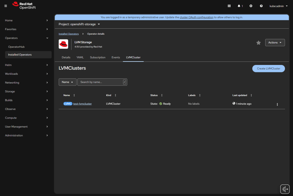 Going to the same terminal, you can enter sudo lvs -a vg1 to verify lvm is configured and space available. I have started testing on OpenShift 4.20 nodes, and have noticed the host lvm.conf filters may hide the volumes, and you can use lvs --config 'devices { filter=["a|.*|"] }' to override that filter.