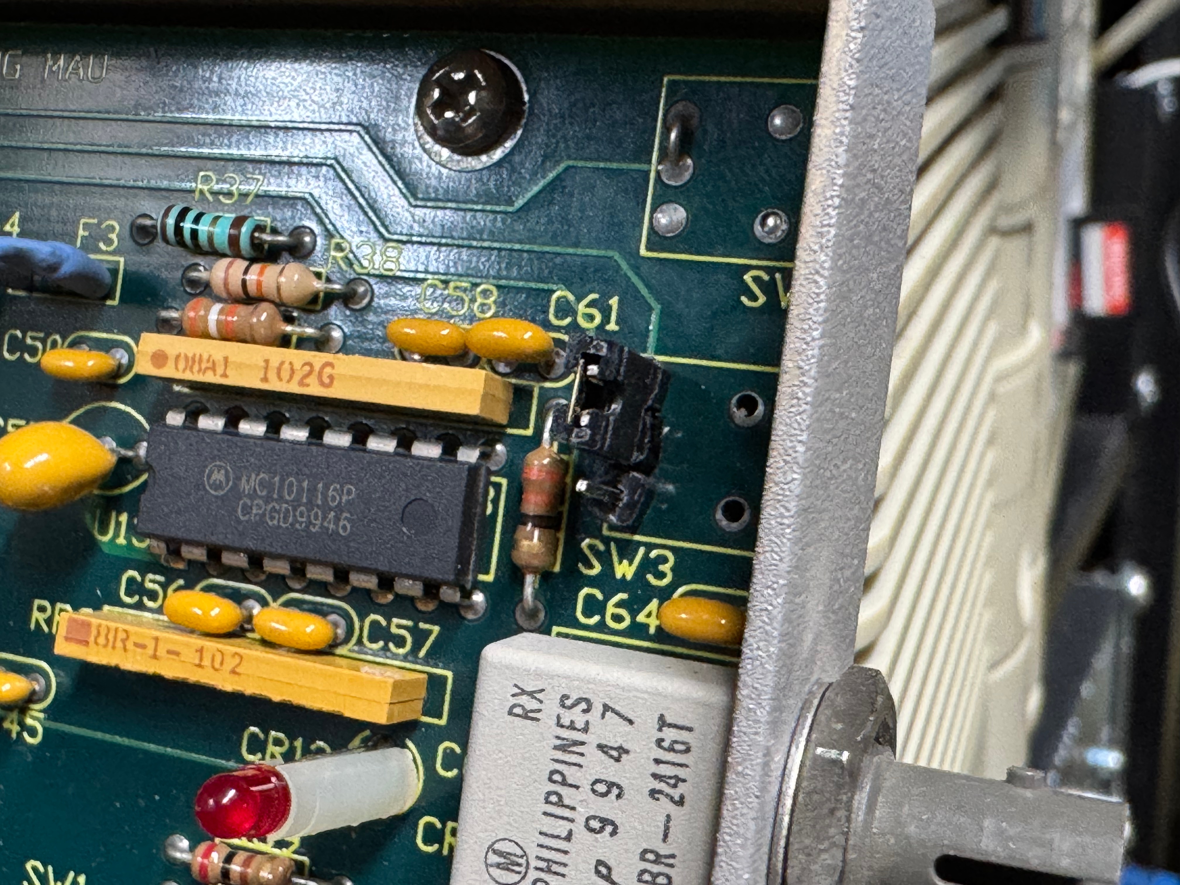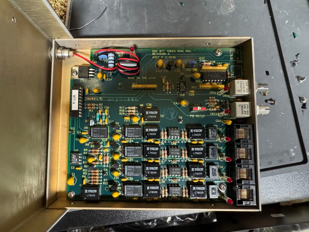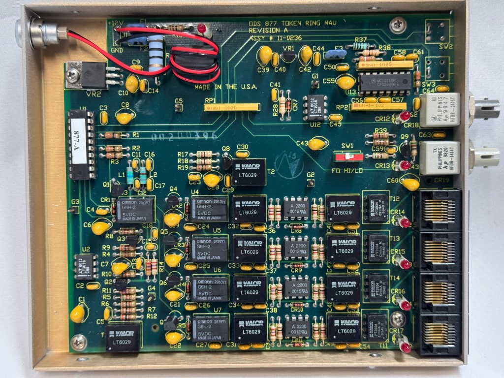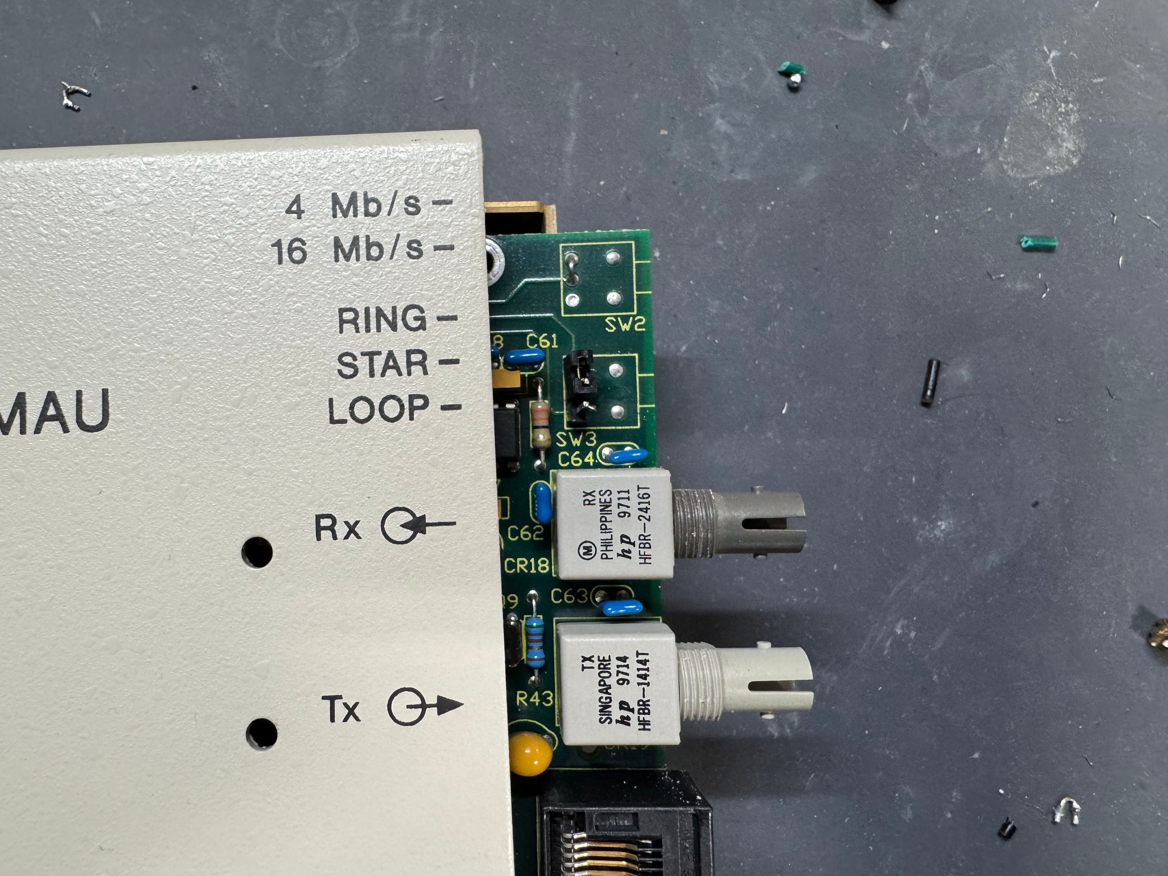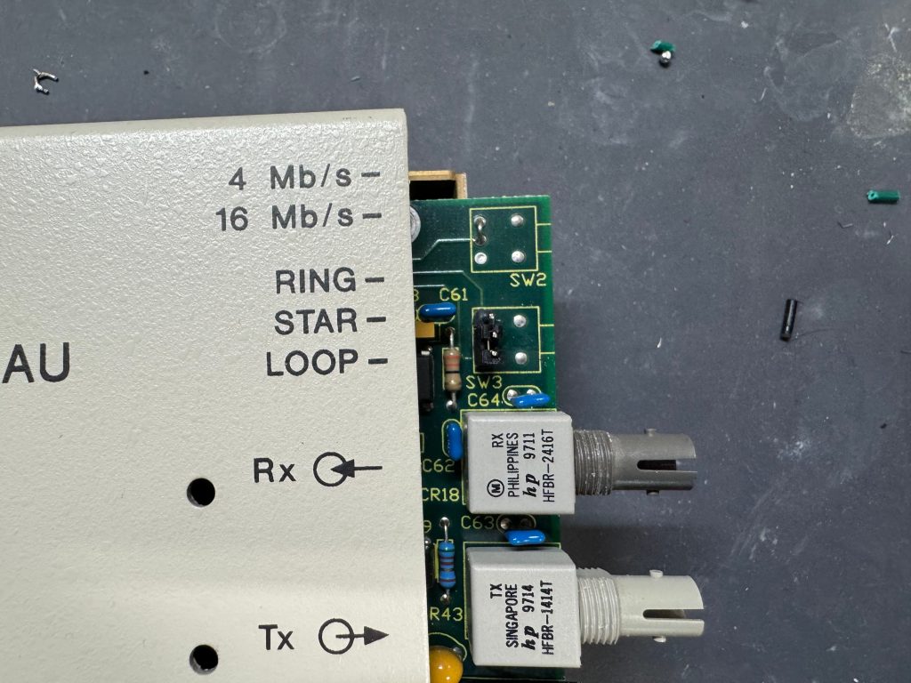 The MAUs were designed to have a switch to go between modes. Neither of mine did, both had a physical soldered in jumper setting their mode. The Motorola one didn’t have a hole in the case for a switch to exist, but the PCB is the same. I removed the soldered jumper and replaced it with a standard PC jumper pin, that way I could easily change it when I wanted to. In the end I will leave them both in LOOP mode most of the time, that has internal termination and is used for simple 4 port usage. Bridging the top and middle pin put it into LOOP mode, which is what I needed. Before that it was in RING without termination; each device would join the ring for 10 or so seconds, not hear anything else on the ring, and then disconnect. This MAU appears to be able to automatically go between 4mb/s and 16mb/s mode and I never moved the speed jumper.