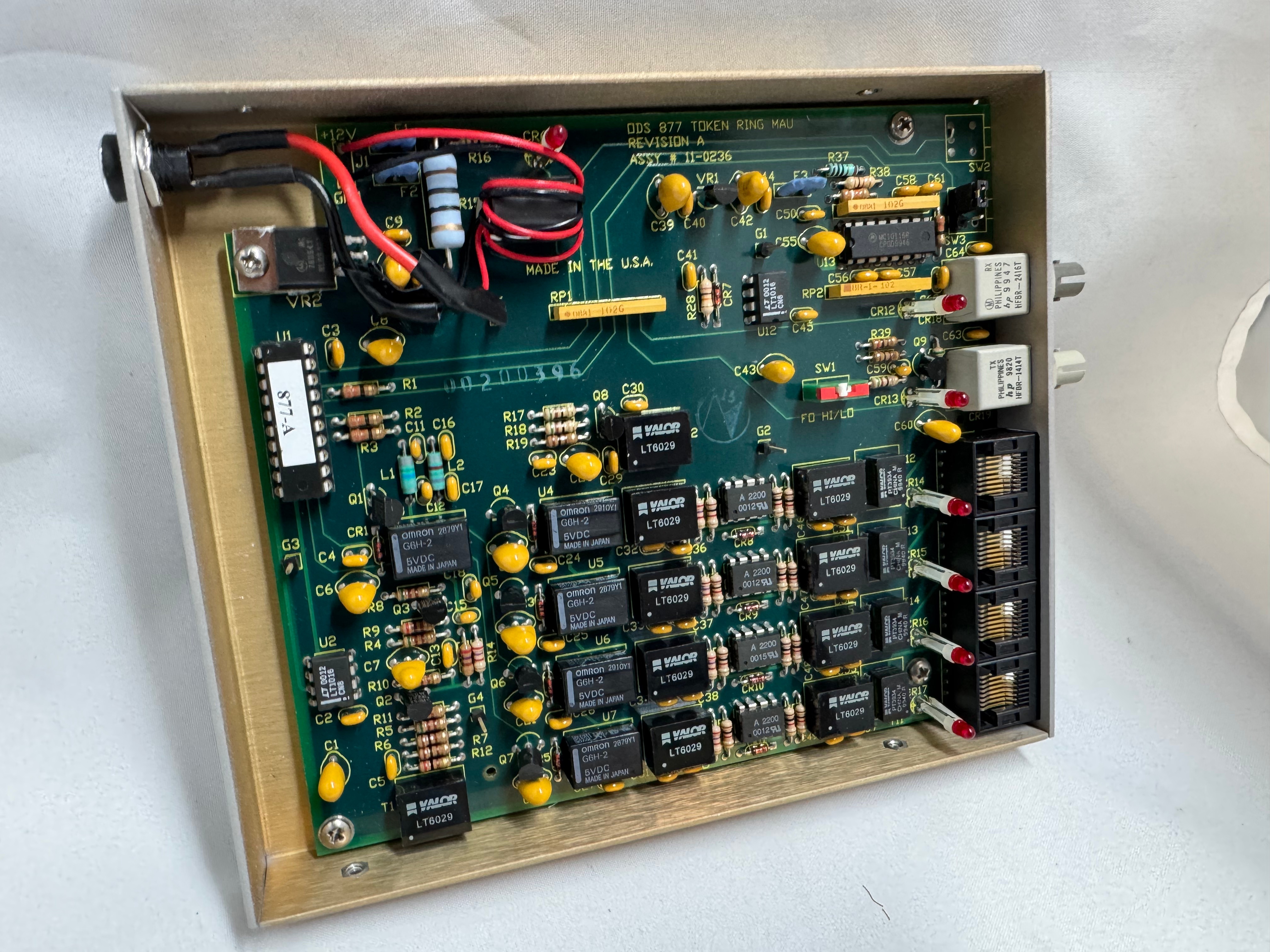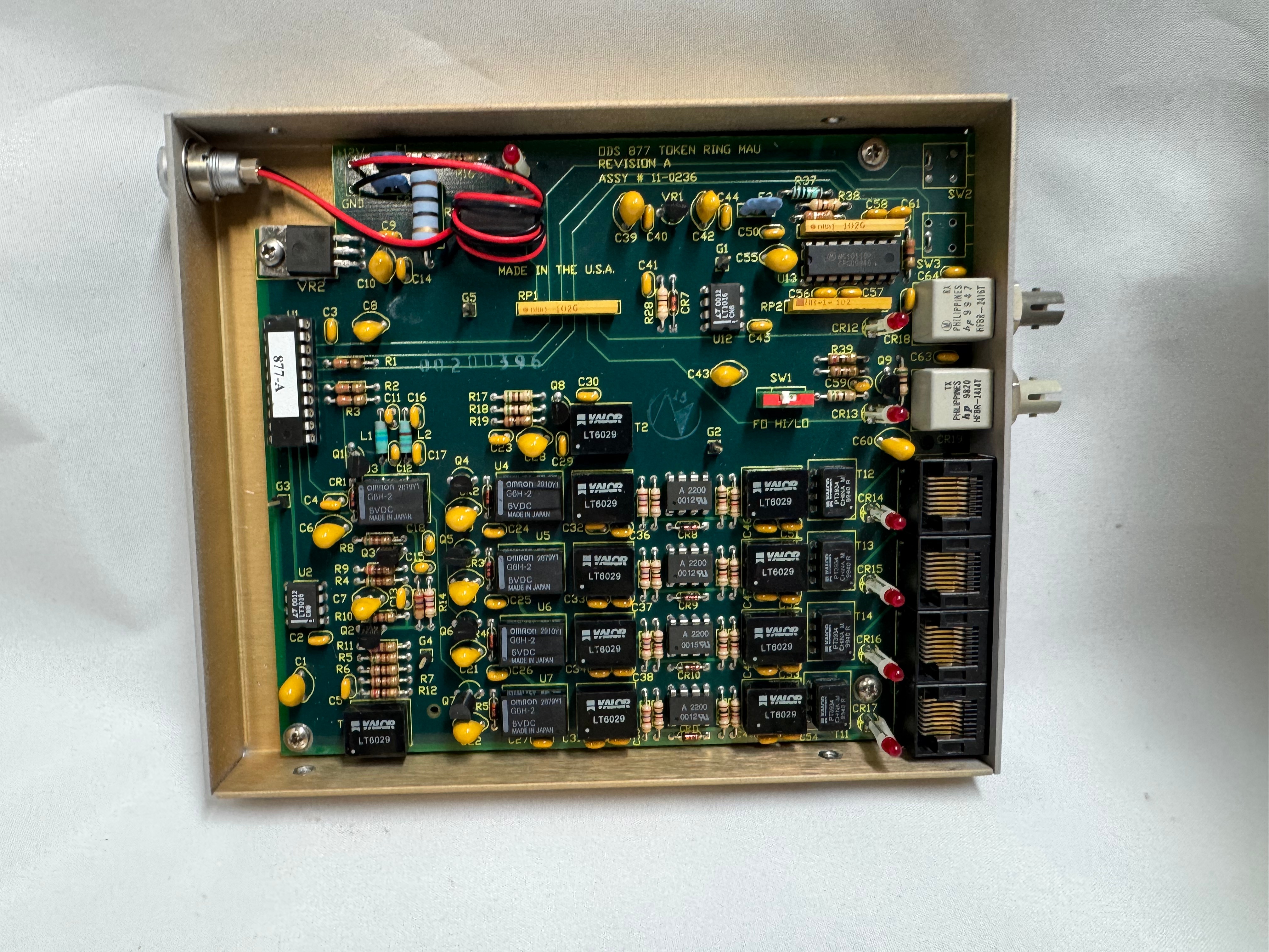 I picked up 2 of the same model MAU. ODS/Motorola 877. These are great units after some hardware tweaks and I would recommend them. While they are the same model, and same firmware revision, Motorola bought the company ODS (Optical Data Systems) which made them. The first one I got has ODS branding and a spot for two switches to control the mode and speed of the MAU. The second one is Motorola branded on the case, but not the board, and is missing the cut out in the case for switches.
