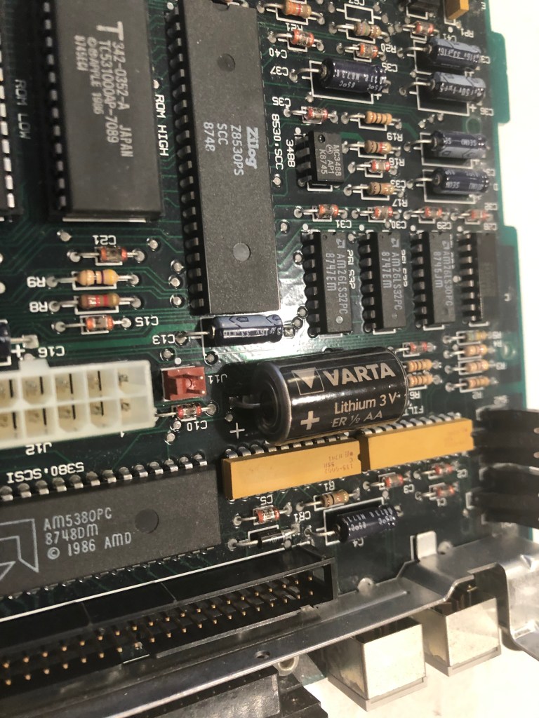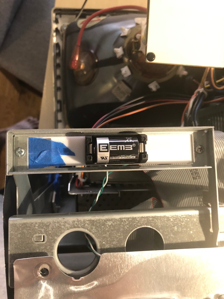 There were 2 more upgrades I wanted for this machine; first the original 1987 PRAM battery was still on the board. Fortunately it had not leaked at all, but I still want to remove it. I purchased a new 1/2AA, 3.6V battery holder and thought I could use the expansion slot in the back to hold it. I am not using the slot, and that way when the system goes into storage I can pop the battery out easily. I had recently gotten a new 3D printer (Ender v3 Pro), and made a mounting bracket. It needed to be mounted on the inside of the bracket because of the high of the battery holder, but it works well!