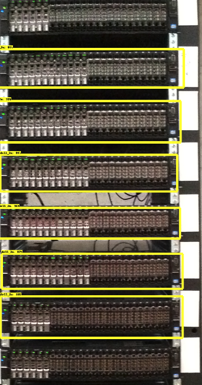 The next step I wanted to do was start matching physical location to logical. The idea behind this is, I can find regions in a photo or video where servers are, and each server through its iDrac/IPMI allows me to blink front chassis lights. So one host at a time I will have automation send the command to blink the front chassis lights, and perhaps some lights on the HDDs, then scan for which region in the photo has started to blink!