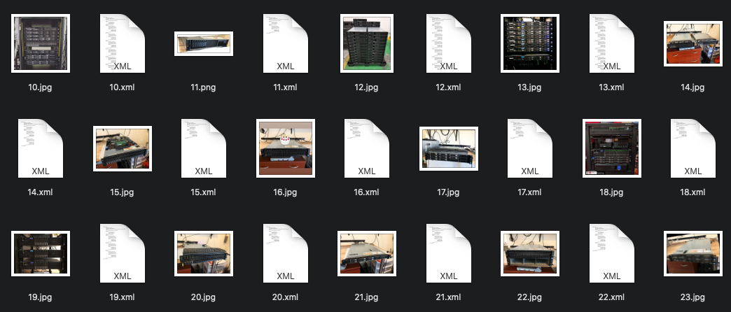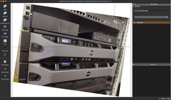 Now that I had the photos, I downloaded GitHub – tzutalin/labelImg: 🖍️ LabelImg is a graphical image annotation tool and label object bounding boxes in images. This is a tool where you go to each photo, select the item you are trying to learn, and label it. This took a while, its fully manual work. A lot of the photos from the web had multiple servers in the photo, and each one would need to be selected. This proved to be one of the more time consuming parts of the project. I had to manipulate the photos to allow the rectangular bounding boxes to be able to fit the servers, even when the photos are at weird angles.