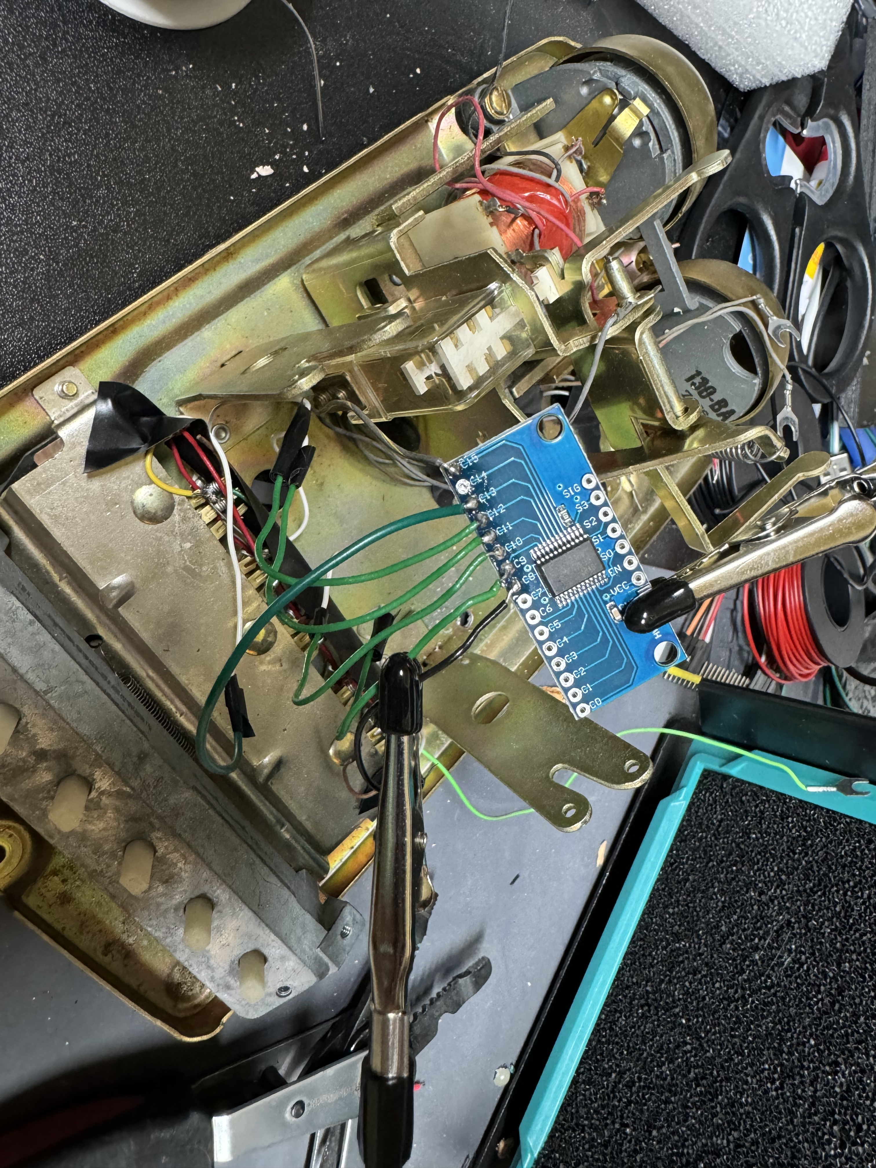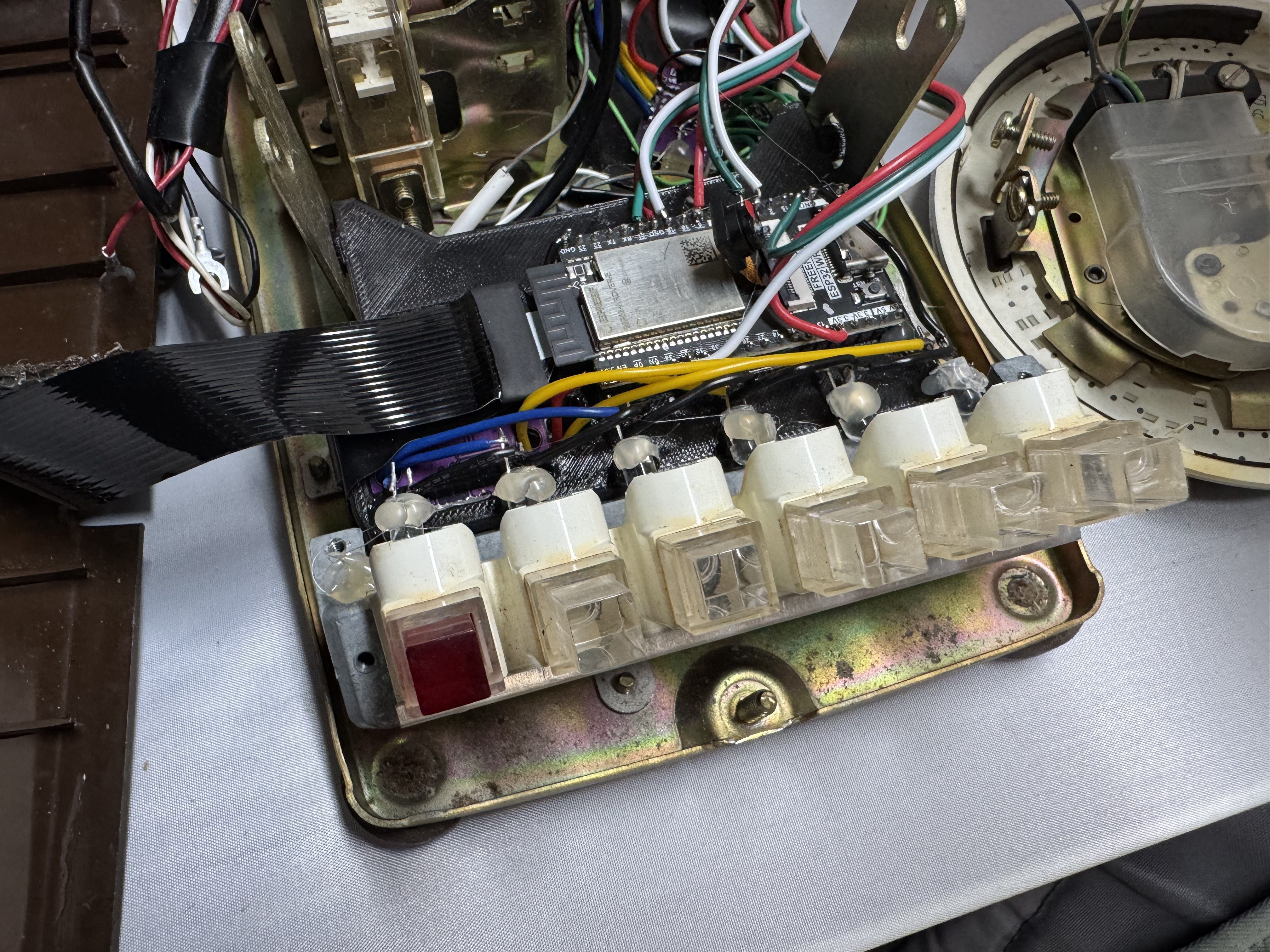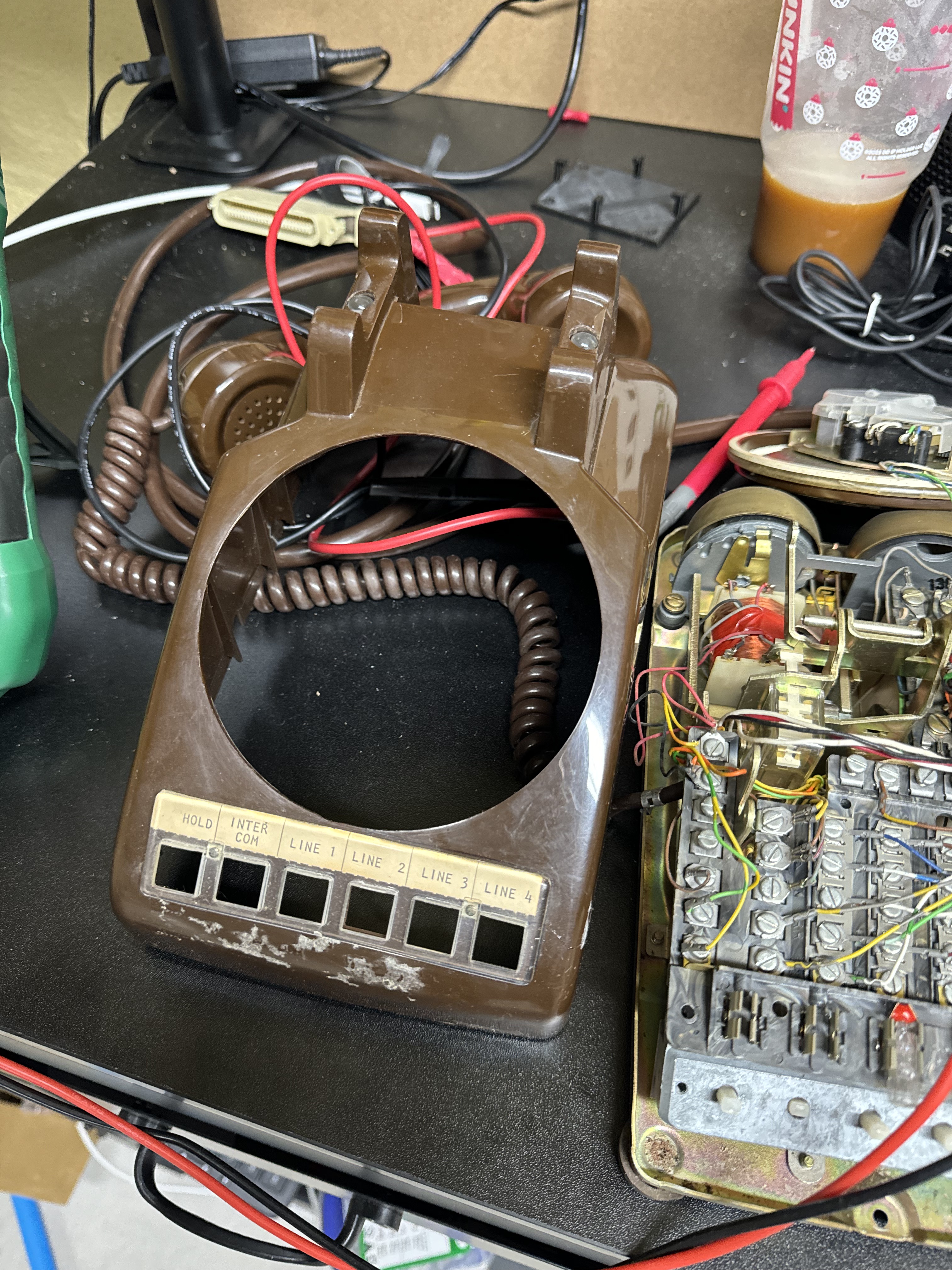 After I had the prototype working, I moved onto to getting a real phone, and trying to get everything working within that. I got this phone that had several lines, and I thought I would use those buttons for different functions. Over time this seemed like overkill and kept me from making more progress. I also needed more IO ports, and had to start using MUXes to do this, which further discouraged me. I wired up all the front buttons to have a LED behind them, and could read if they were open or closed. All I ended up doing was lighting up line 1 when the handset was picked up. The buttons do have a great tactile feel though.