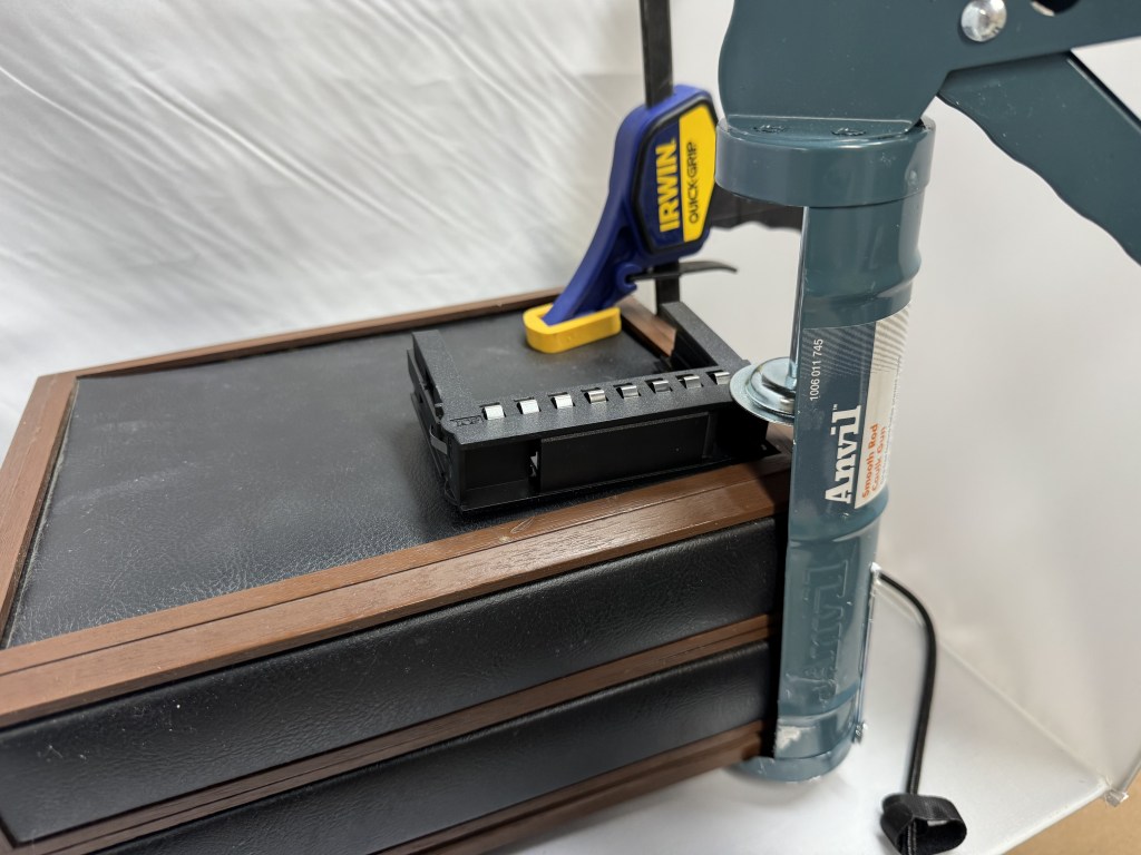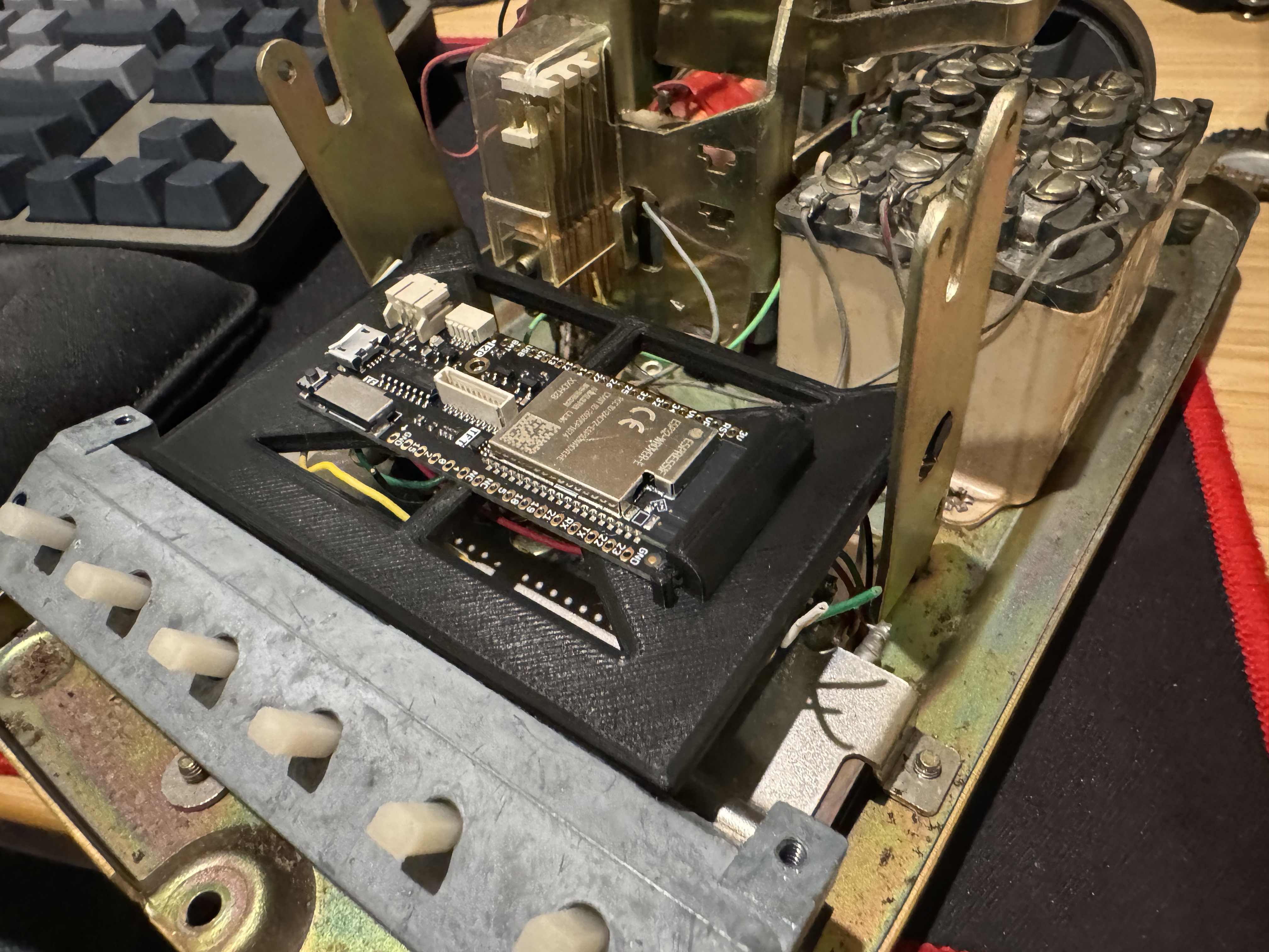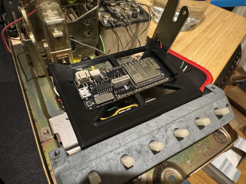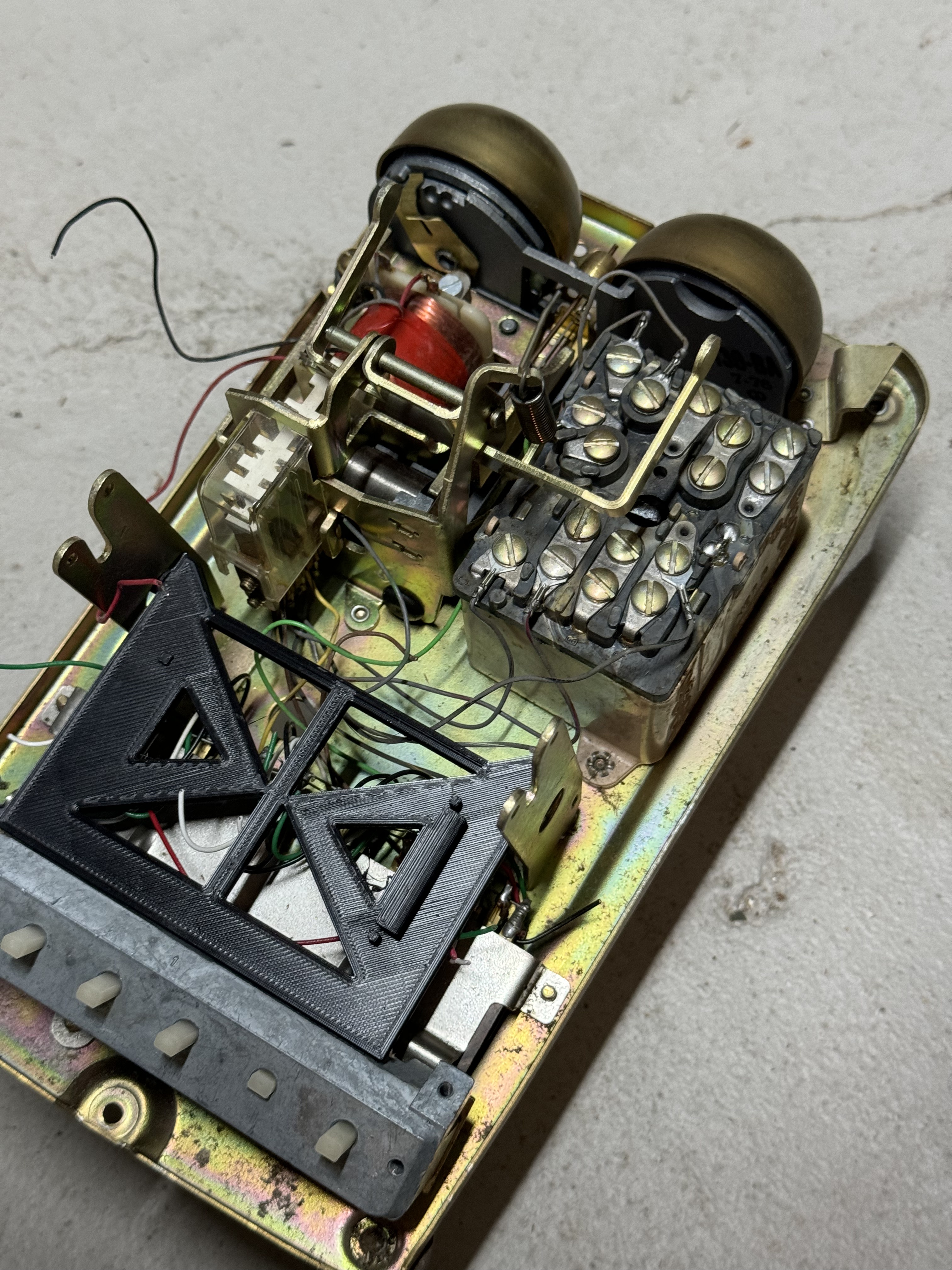 For this phones hook signal, I had to remove the piece that would usually be triggered to fit in the ESP32. I modeled and then 3D printed a bracket that holds the ESP32 in the bottom, and at the same time it has spots for two switches that get contact when the handset is put down.
