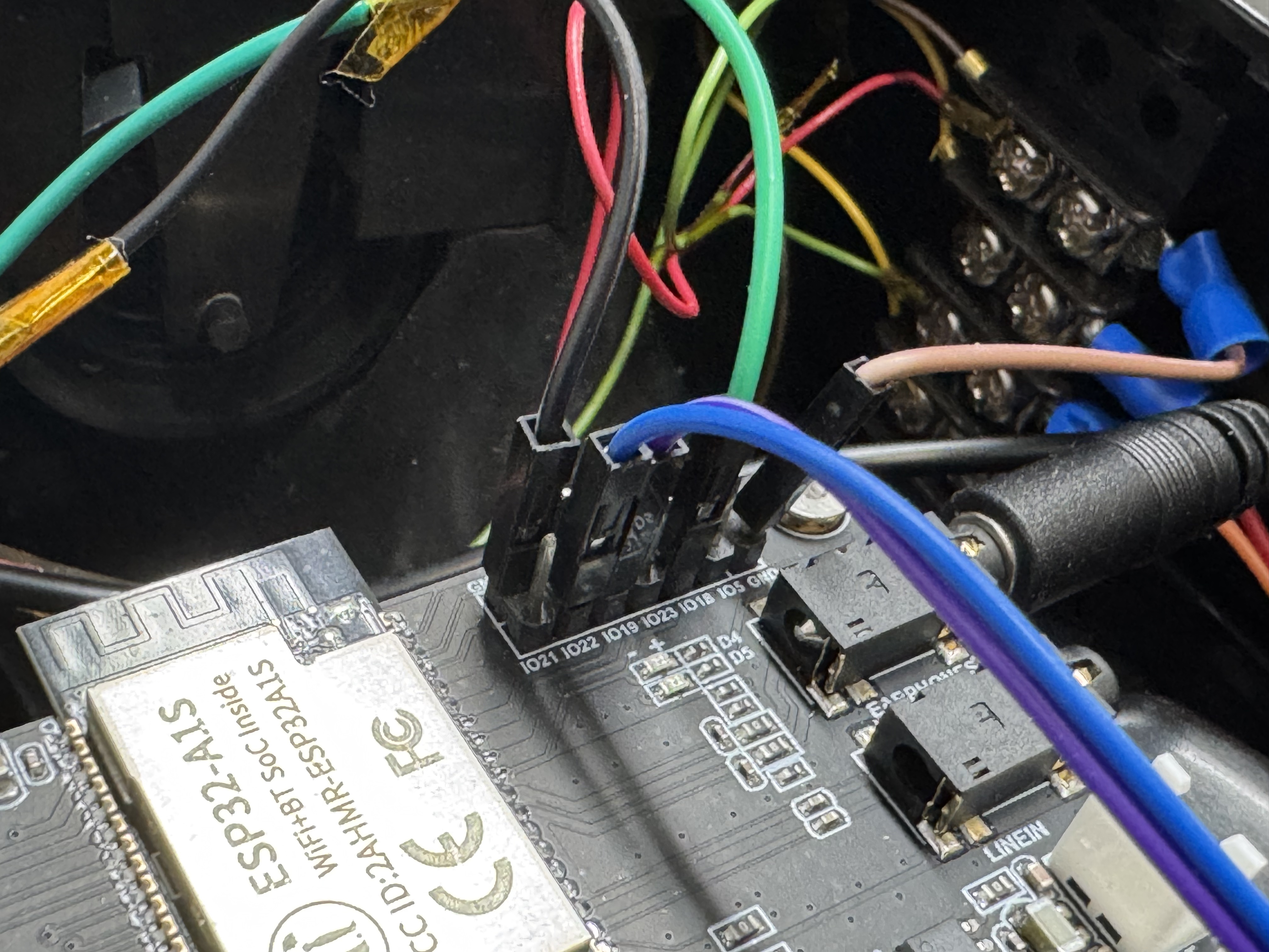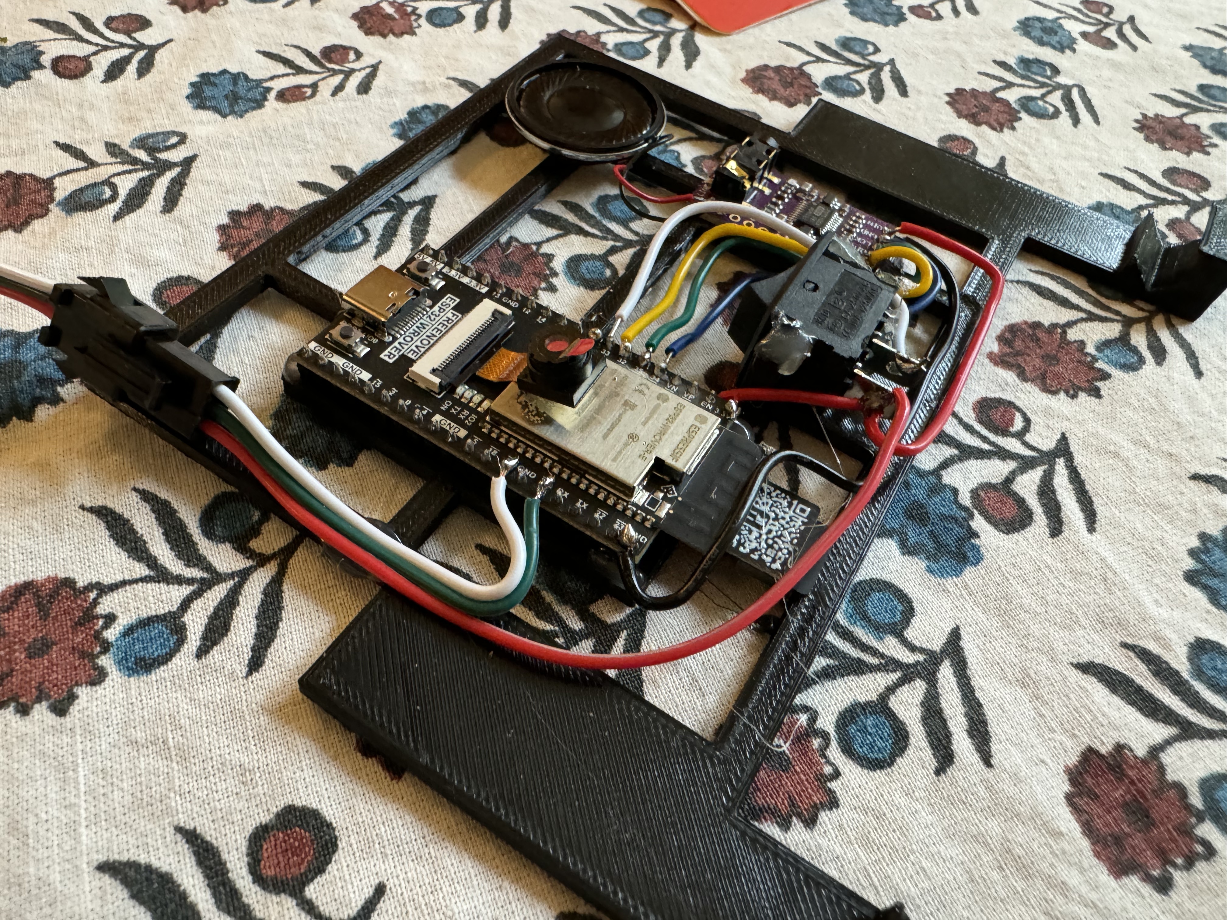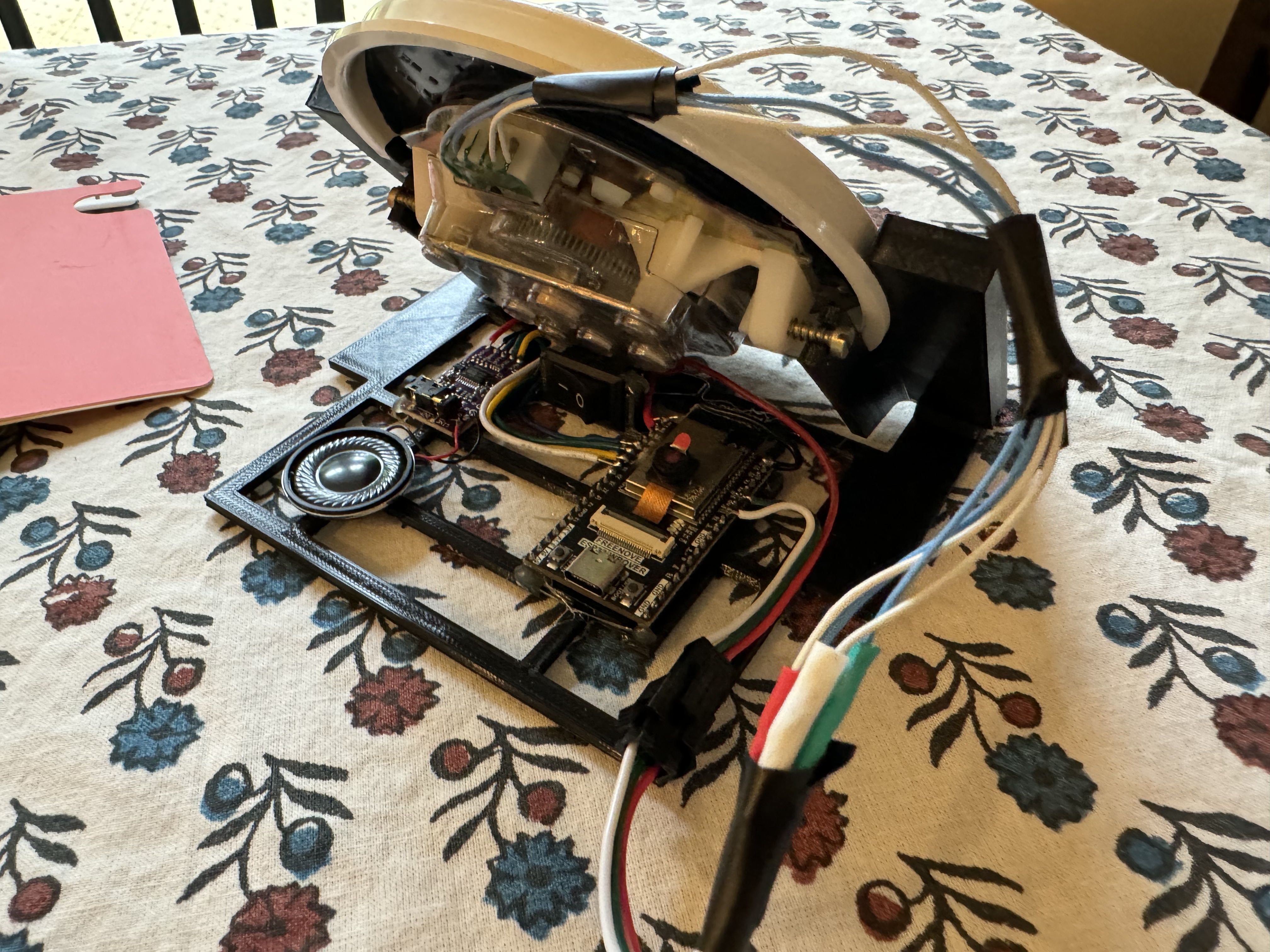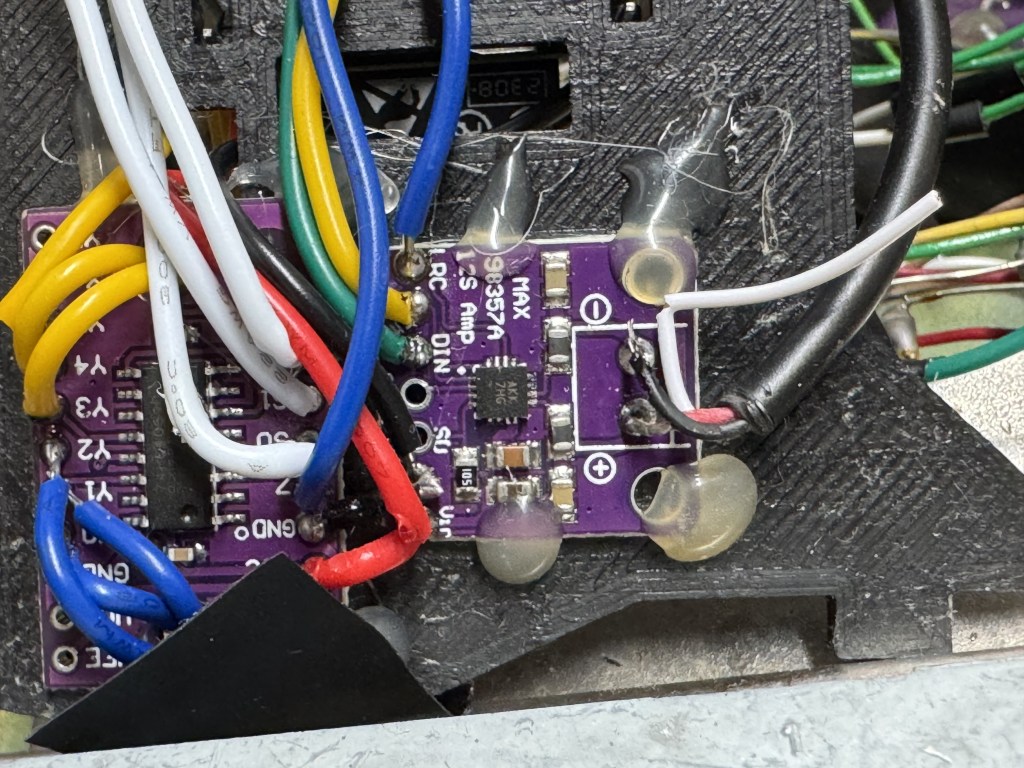I tried to do clean wiring on this one. With the ESP32 I used for this version, Freenove CAM Board, it came with headers. I used those below through this mounting plate that swiveled to connect to a MUX and audio amp, a MAX98357.
