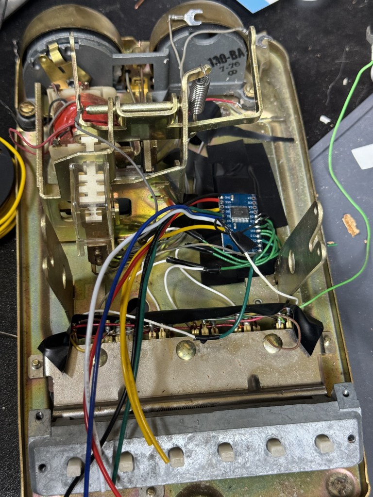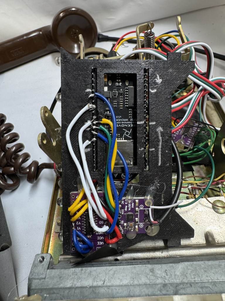 To get the hook signal, I connected to the old phones terminals that close when the phone is on the hook. This worked decently, except I added some code to take several readings and average them. I think the old contacts weren’t the cleanest leading to periodic bad readings.