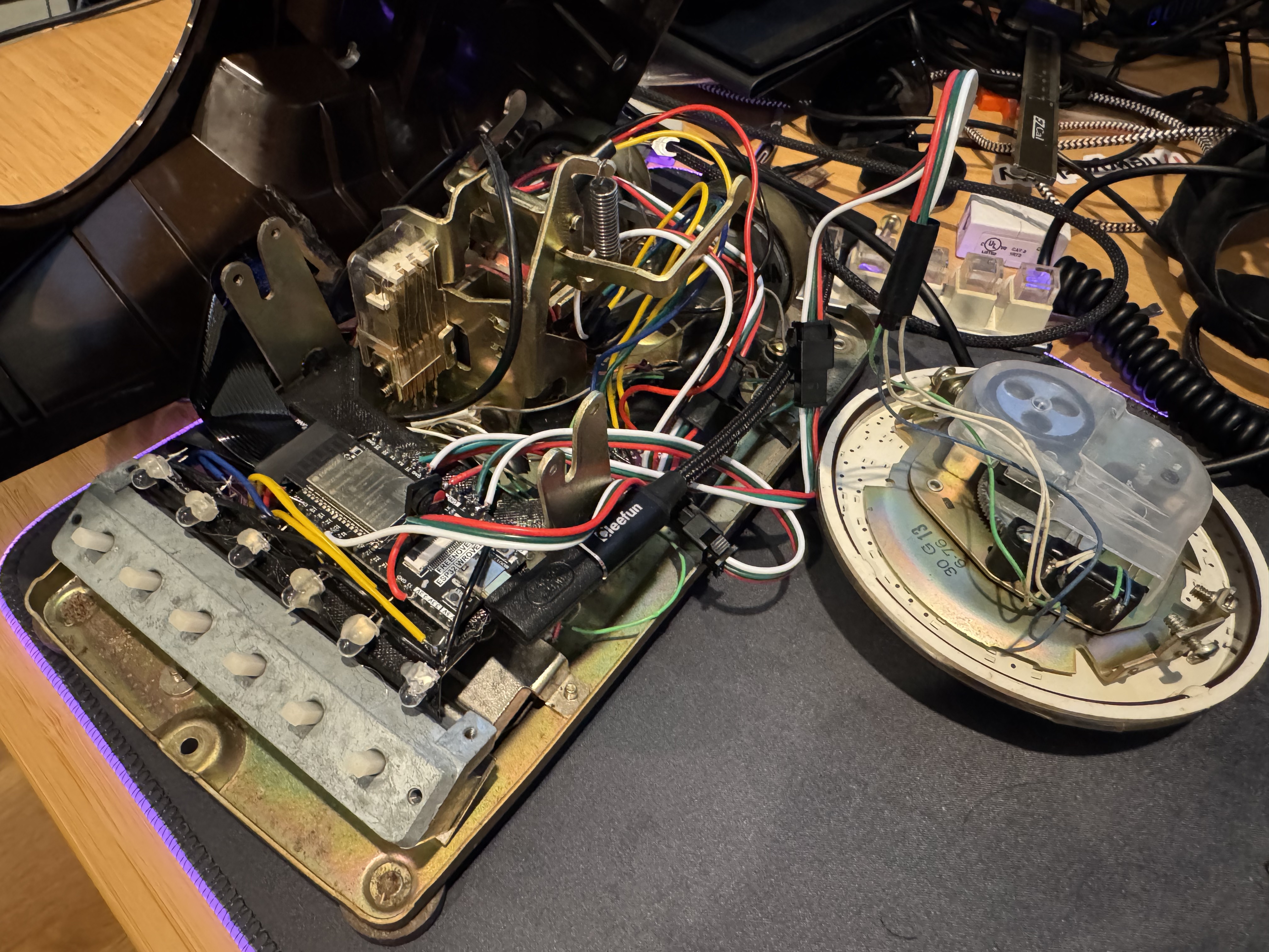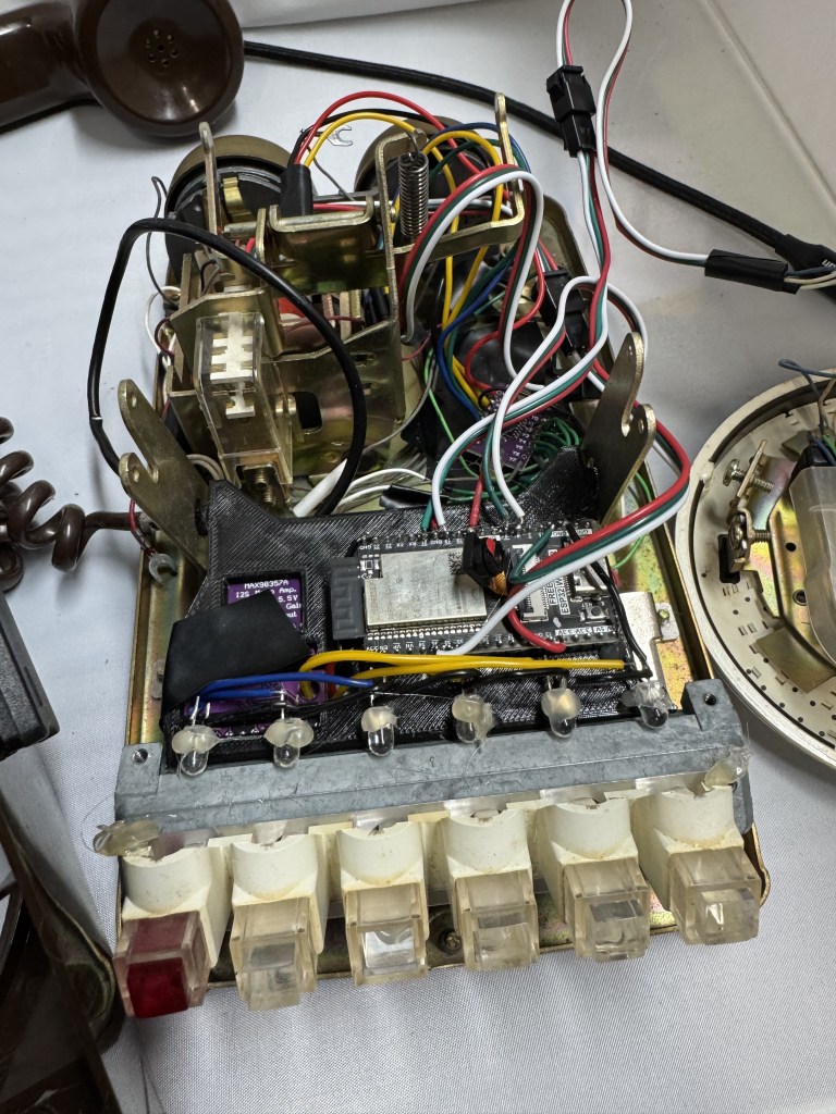 This version of the phone, was an actual phone… That cost $59 on eBay (ones with all the lines were extra), then same $17 ESP32. I installed a few LEDs, MUXes, and an audio amp. This version probably cost closer to $75, and I used this as my test bench for… Almost a year as I on and off worked on this.