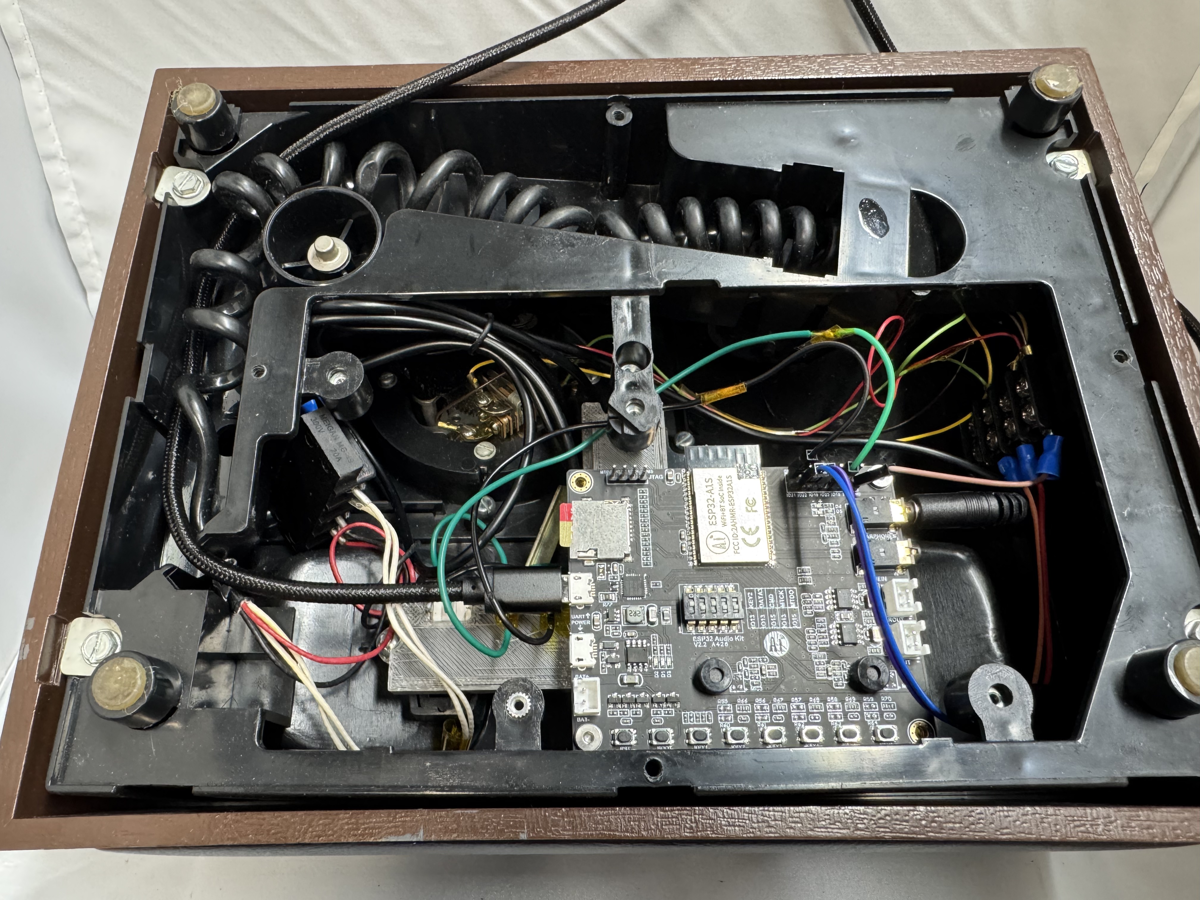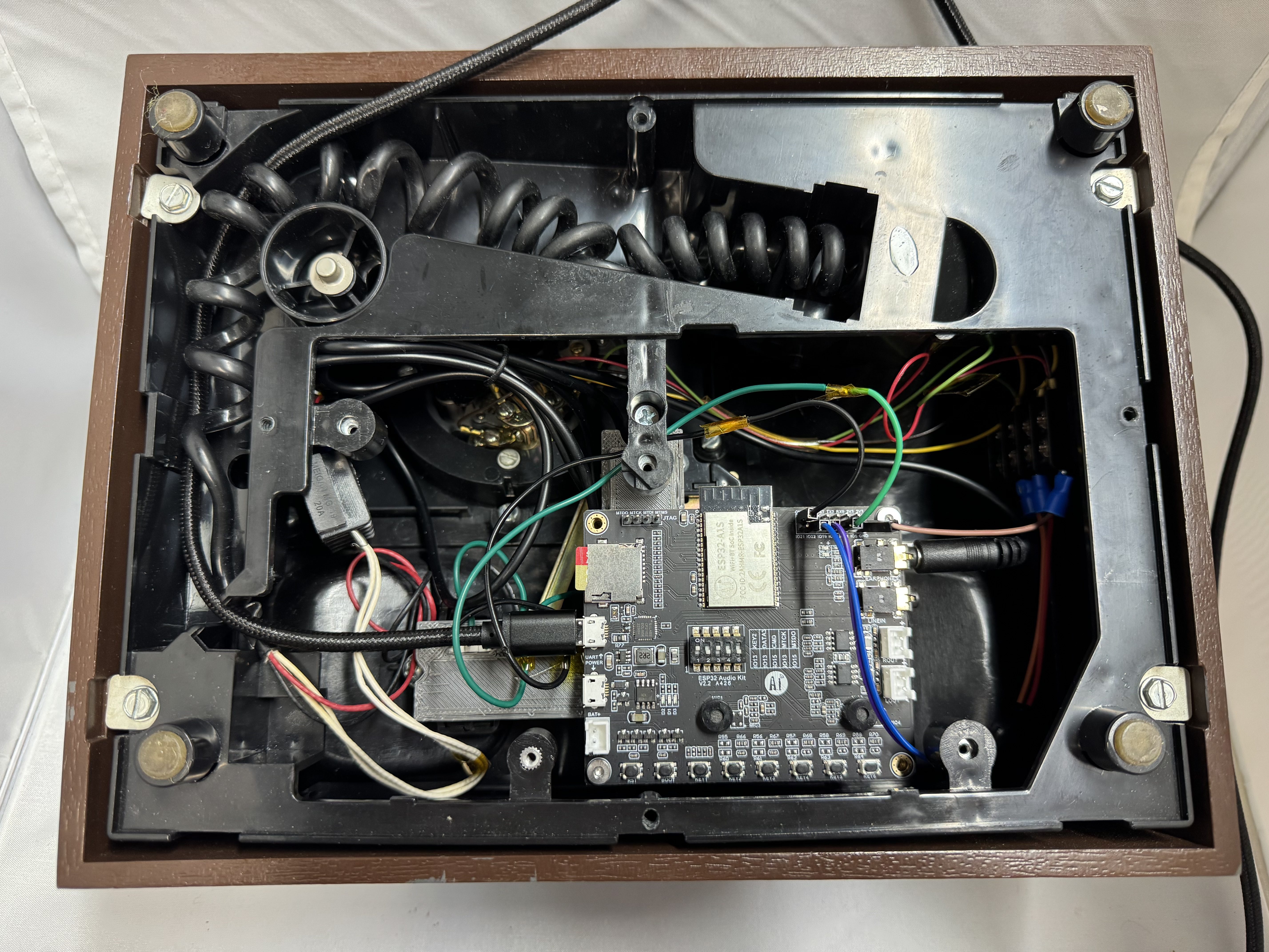 This version of the phone I got (all these prices are with shipping) for $35, its a nice solid unit. The new ESP32 board was $22. Then I added 2 switches because I needed the hook signal, and some terminals. This version of the phone was closer to $60, and I spent about a month here and there on it.
