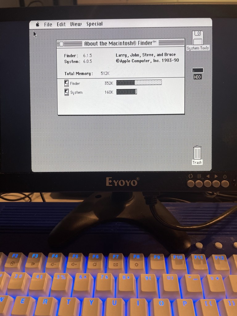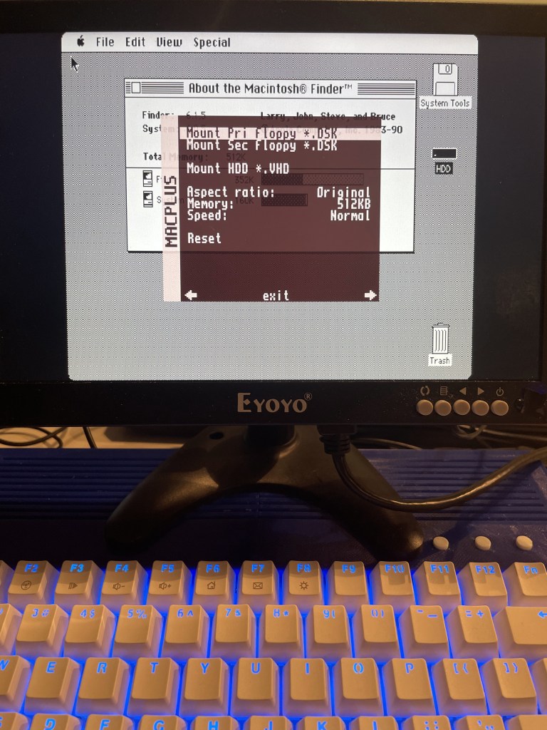 After all the posts I have done on here recently I couldn’t just play around with the 486. I also got the Mac Plus side of the house running. You can run with 512kb, 1mb, or 4mb of RAM. It has a 20MB HDD, and 2 floppy drives. There is also a Turbo mode, which we obviously need because turbo! And because classic Macs can be slow…