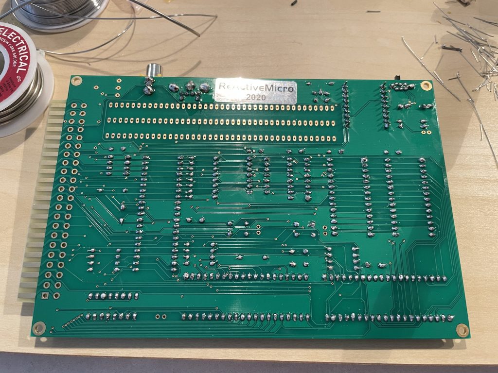 I got it all together, and the board started the first try. I did have the same issue the person who made the video had; I was getting a lot of noise and characters added to the screen. I reflowed a lot of the sockets, and made sure all the socketed chips were fully seated. That cleared up the garbage at startup. The wiki also has some other notes on noise issues the board can show.