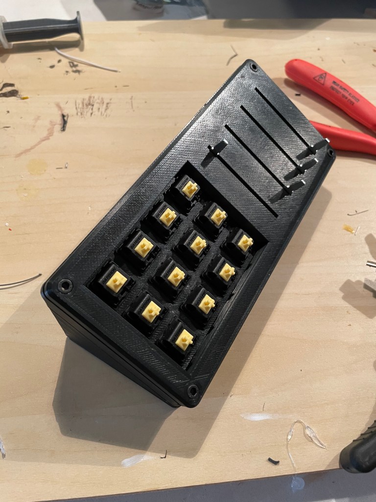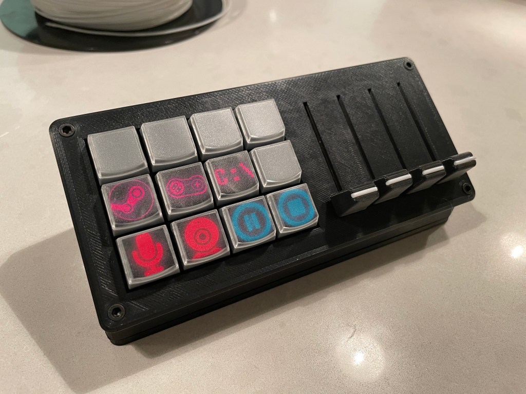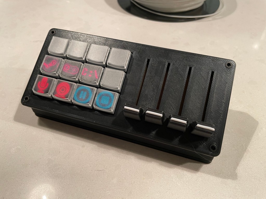 For software, I looked at several pieces of software to use the keys and sliders with. I looked at software like VoiceMeeter. While overall that worked, it was very inflexible, and had a giant interface for things I didn’t want to use. Then I found Midi-Mixer, a passion project by a single dev and it is EXACTLY what I needed. The sliders can control single app volume, which is easy to select. And the buttons can be programmed for anything! And easily with a GUI instead of conf files like some other open source projects.