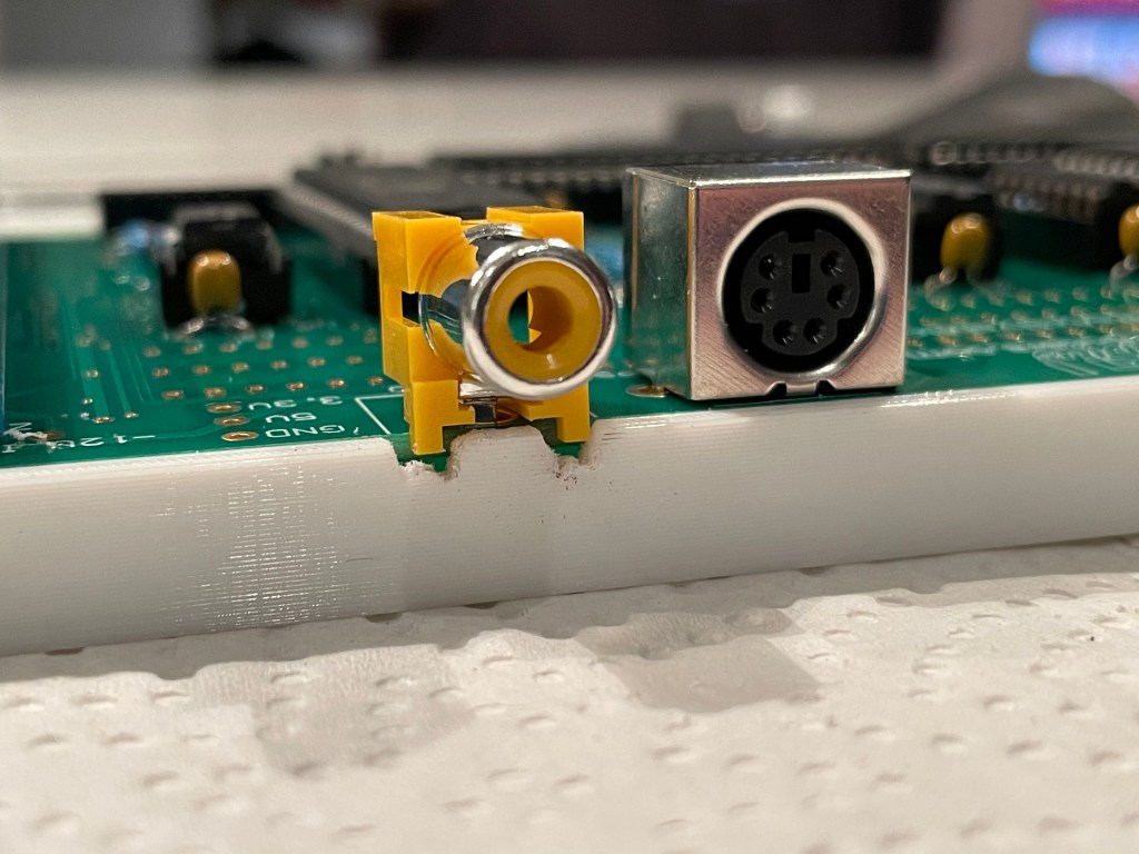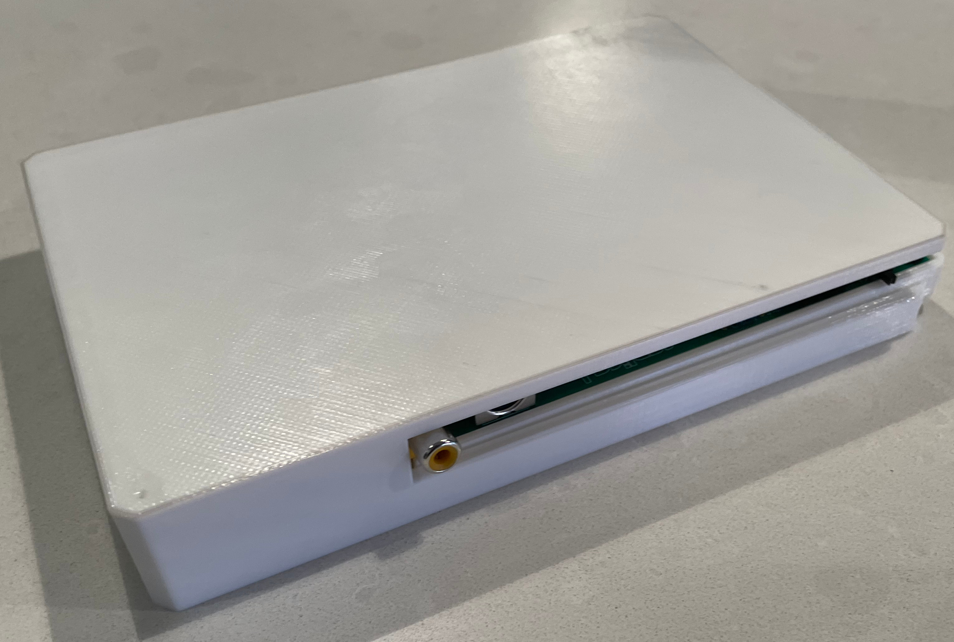 I wanted to put the board in some sort of case, and after searching online I couldn’t find any. I thought I would throw something together quickly that I could put the board in. I took some measurements and threw together a V0 of the case. One small issue was I didn’t account for the RCA jack the video comes out of little let that sticks out. Instead of spending another 7 hours printing a new one, I used a little saw I have to cut a hole out.