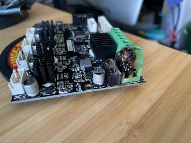 I opened up the controller compartment and was shocked to see how badly the terminals had been melting! Apparently, the wires are tinned and overtime with the movement of the printer and work their way out of the terminal. This leads to the power arcing and melting the plastic. The suggested fix is to replace the terminals (or the board), and then install “ferrules” on the ends of the cleaned cables.