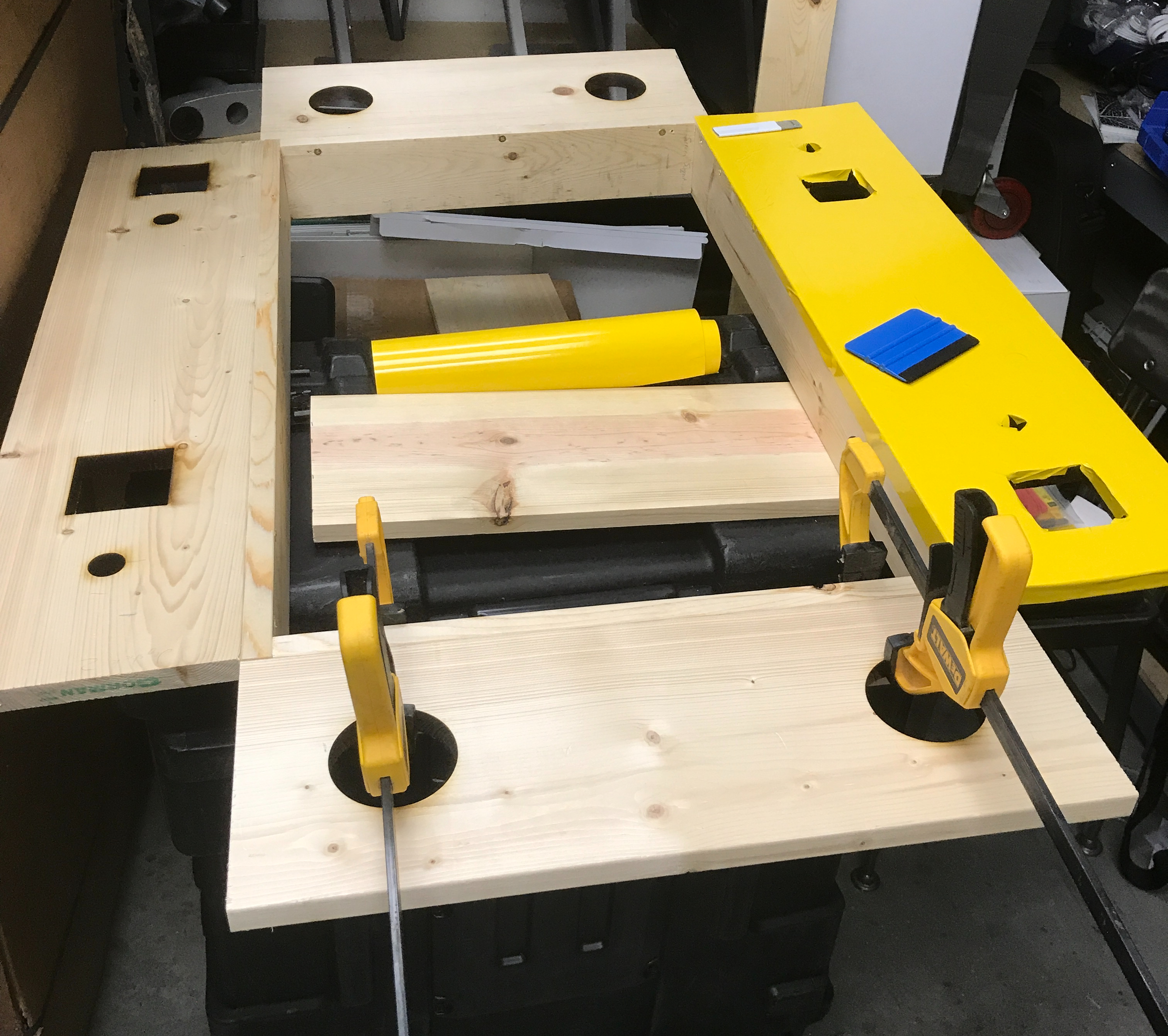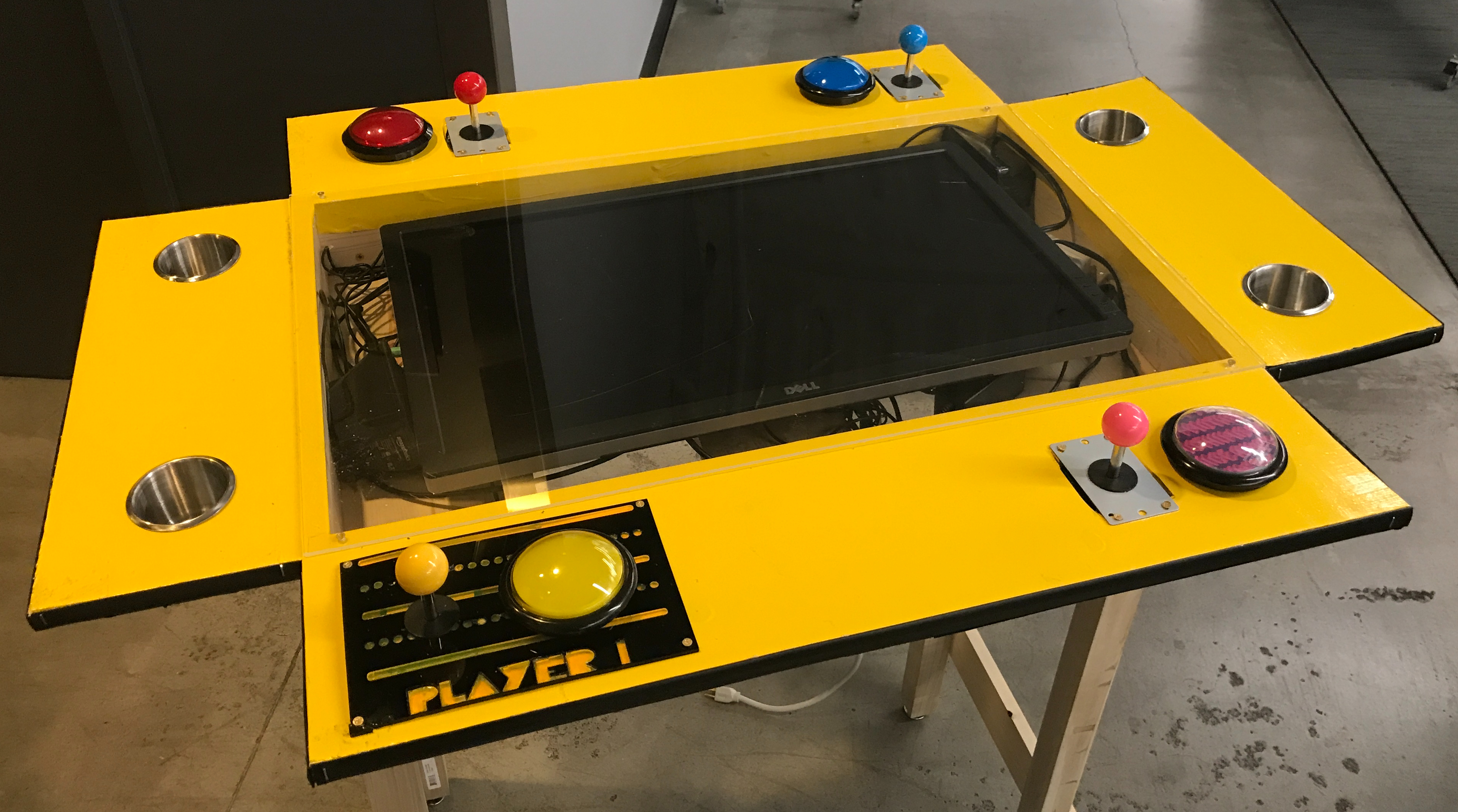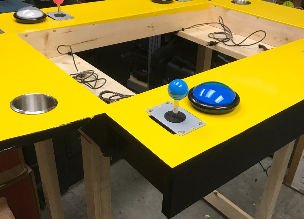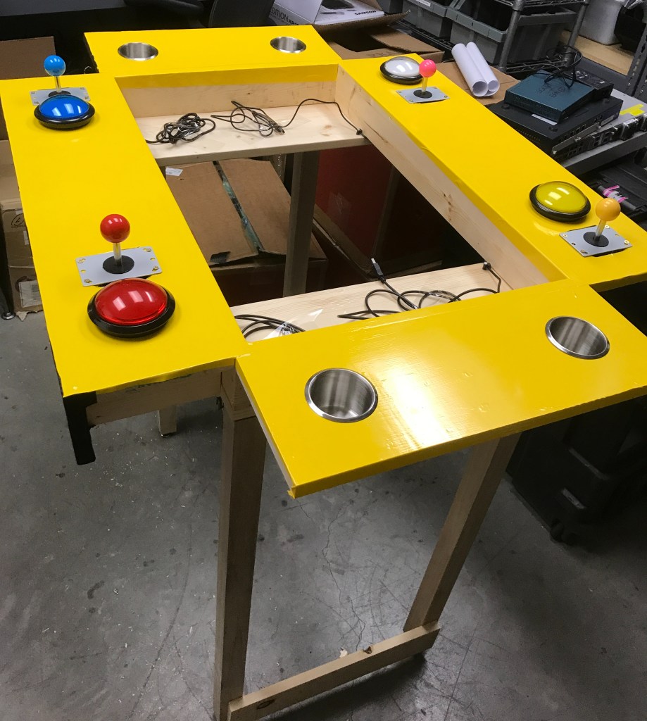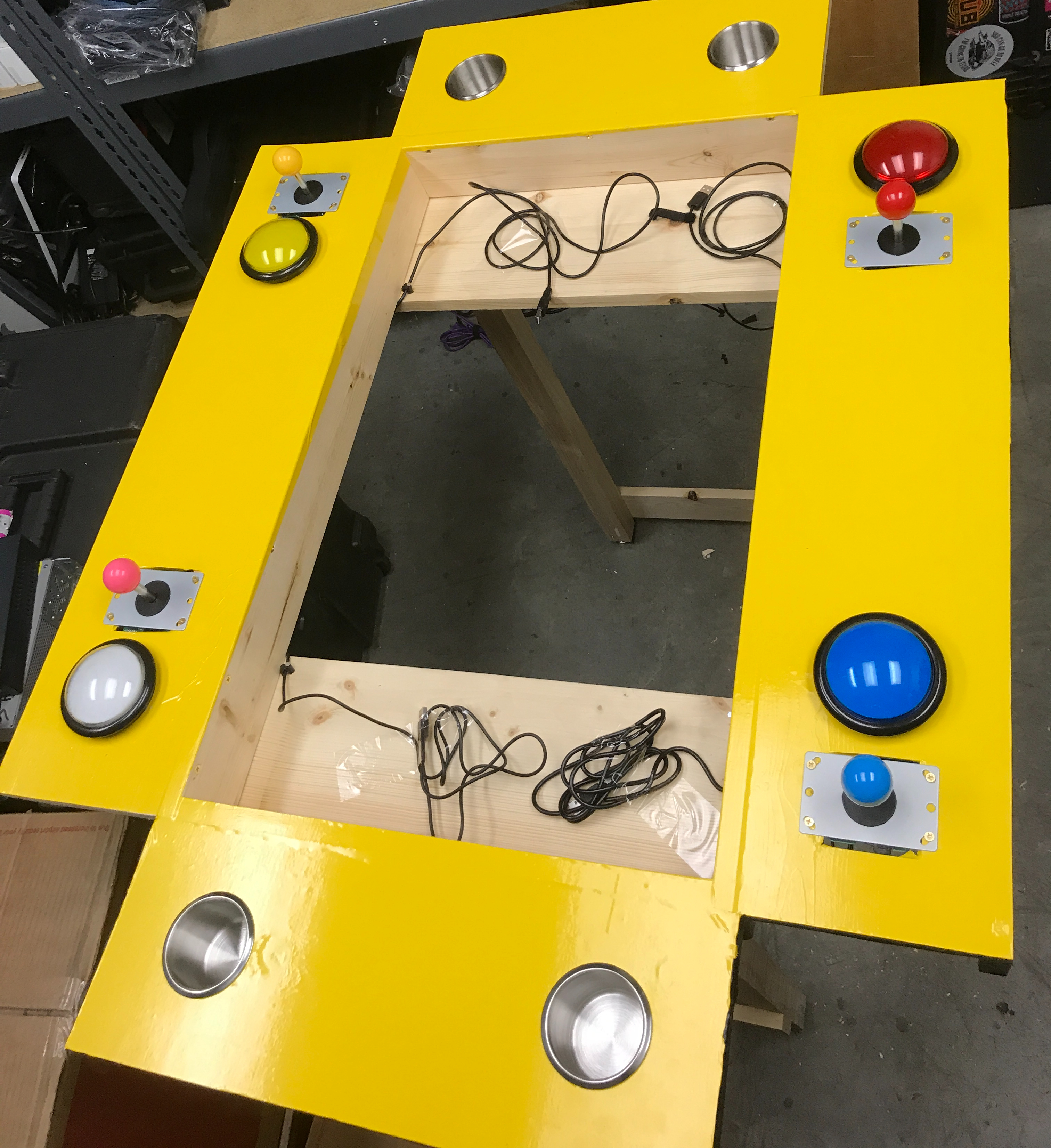 Most of the construction was actually done in one weekend in 2017, I got some 2x4s and went to the maker space I am a member of fat cat FAB LAB – NYC Hackerspace to cut the boards down to the sizes. Now this was a bit of a rough day because I was in NYC, and I am literally grabbing large 2x4s (some are 6 or 7 feet long) then walking a few blocks to the woodshop as people are drinking on a Saturday around me on the streets, then cutting them and walking several blocks to the office. After all is said and done, I used a normal drill and some wood screws to put it all together. I then used yellow vinyl wrap to make the table a bit more dressed up. Getting bubbles out of the vinyl wrapper, on a wood surface that isn’t completely flat was a bit of a challenge. I had a area for the screen to go in, then 4 sides; 2 with cup holders, and 2 with joysticks.