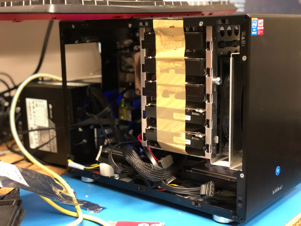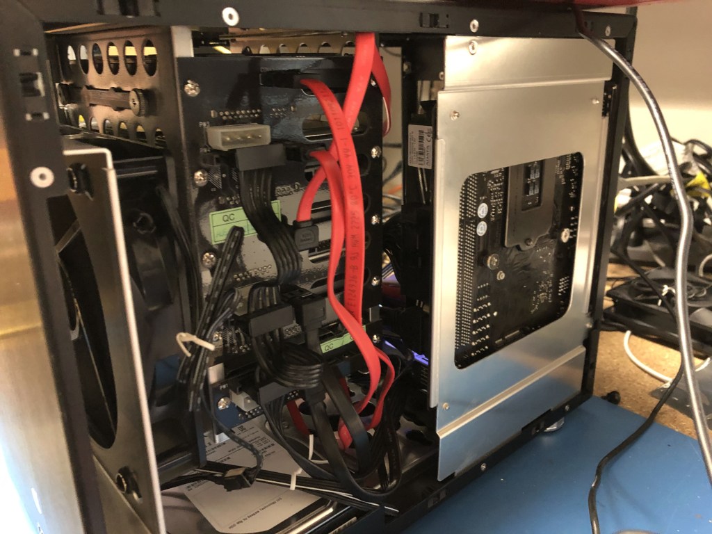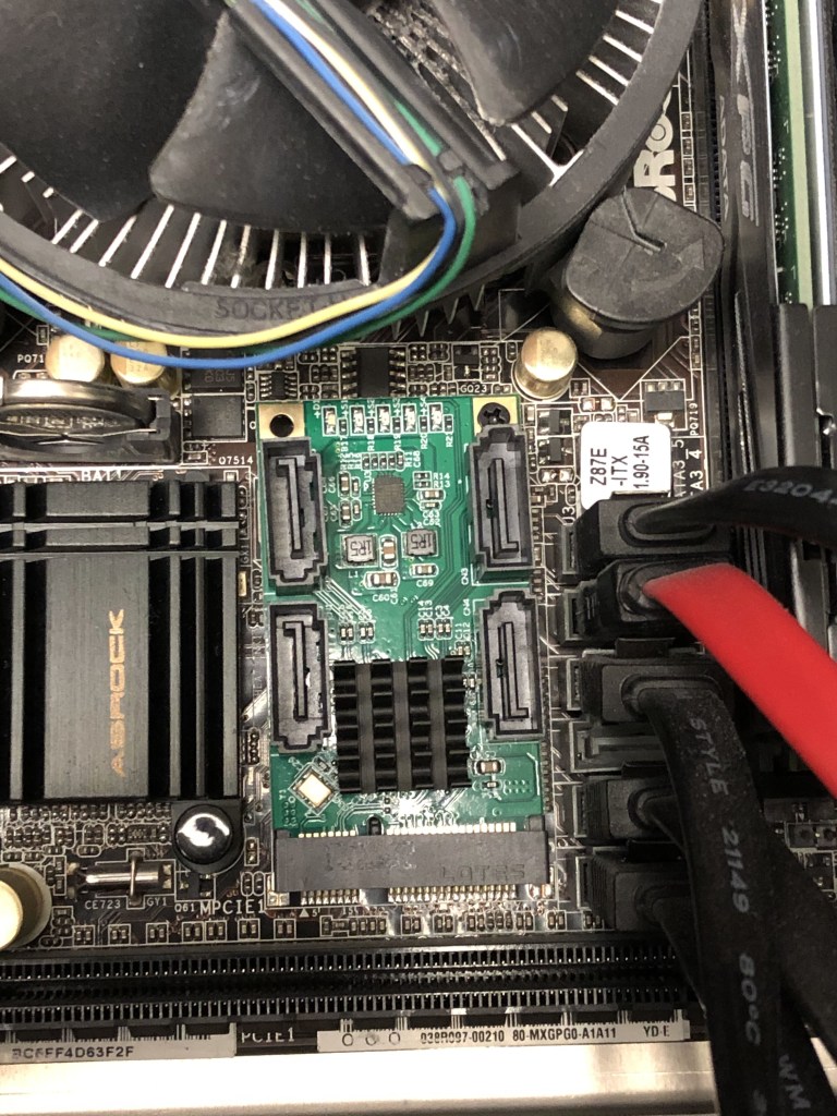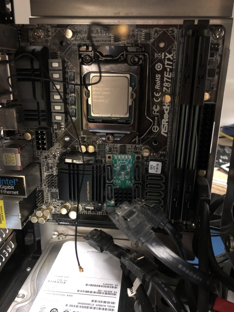 First of all, yes the card is at a slight angle, but it works fine and is secure, so we will ignore that. I also used this time to upgrade the CPU. If you look for 7 year old CPUs on eBay, they are actually not that much money. I went from a Celeron from when I bought the system to a i5-4590. With this new CPU (and breaking a leg on the stock cooler) I ordered a new CPU cooler. That turned into an issue because they sent me the wrong version for an AMD instead of the Intel mount. You can see the very very tiny clearance that the CPU cooler has to the chipset heatsink. I also had this system in the office, since with adding disks to ZFS you need to destroy the pool and rebuild. I had to move all the data off to another system, destroy the array, then move it all back. Dynamically adding disks is always a dream ZFS has had and is always around the corner. Hopefully with OpenZFS 2.0, and the merging of the Linux and Unix code bases, we will get shiny new features like that.