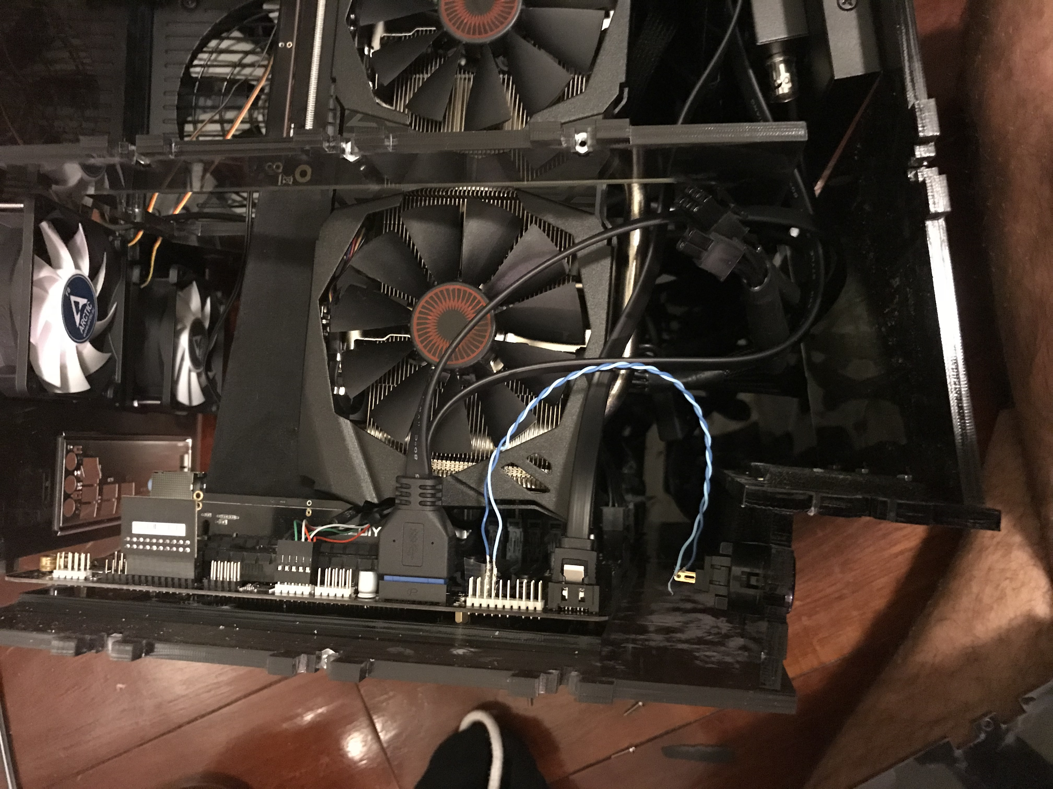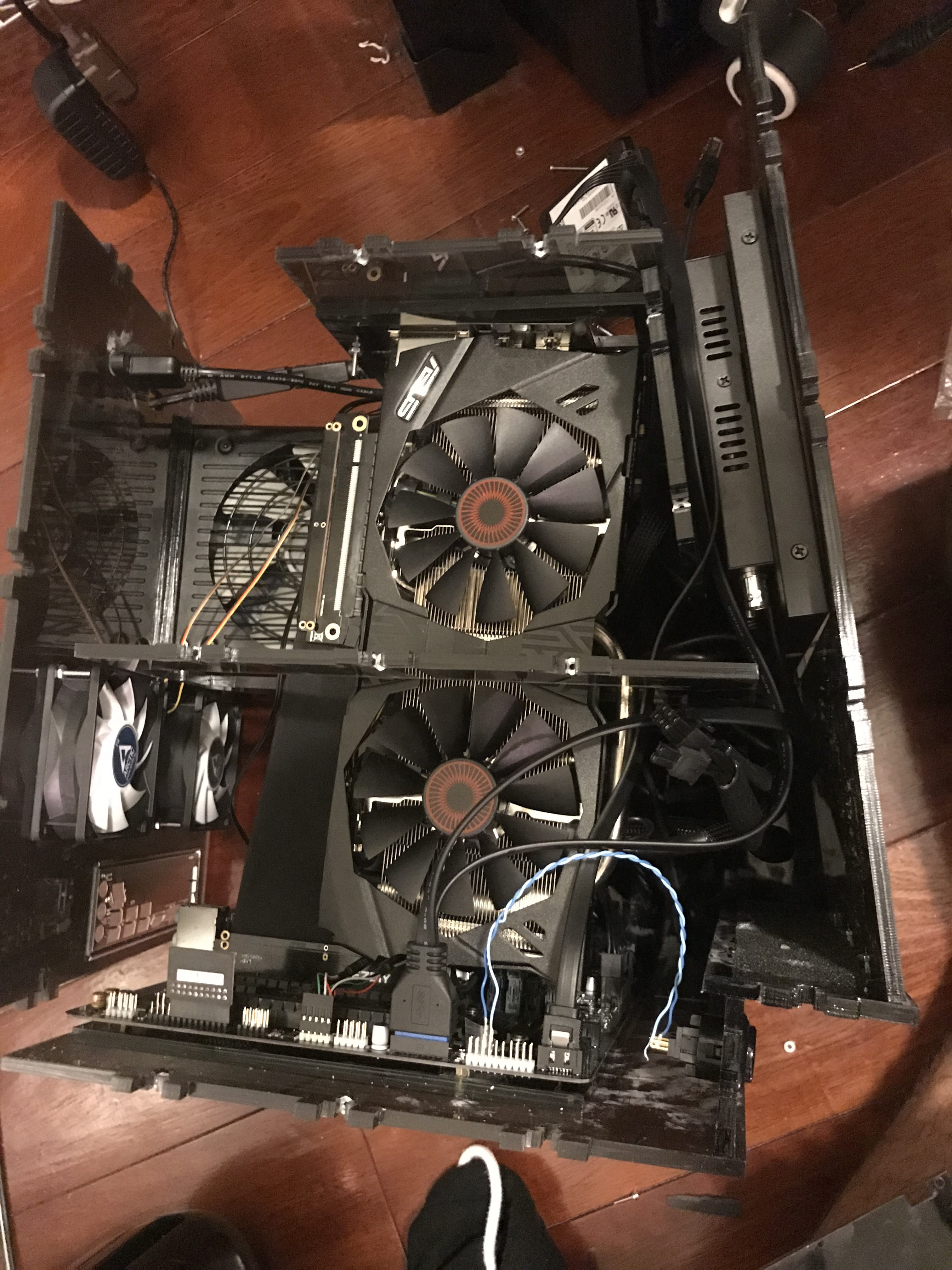 The main method of construction for the case is “Interlocking T Bolts”, as described in https://www.instructables.com/id/How-to-Make-Anything-Using-Acrylic-and-Machine-Sc/ . This allows 90 degree acrylic pieces to snap together and hold together tightly. The primary design has the two sides doing the main support and sitting on the table, with a few layers internally. This has the added benefit of not having the motherboard sit on the ground. I left a good amount of room over the motherboard for airflow, then have 2 fans out the back, and 2 out the top. The main air comes in the front, and then goes over the GPU and motherboard to go out the back and top. The motherboard I got only had 1 fan plug on it, so I used a fan multiplier.